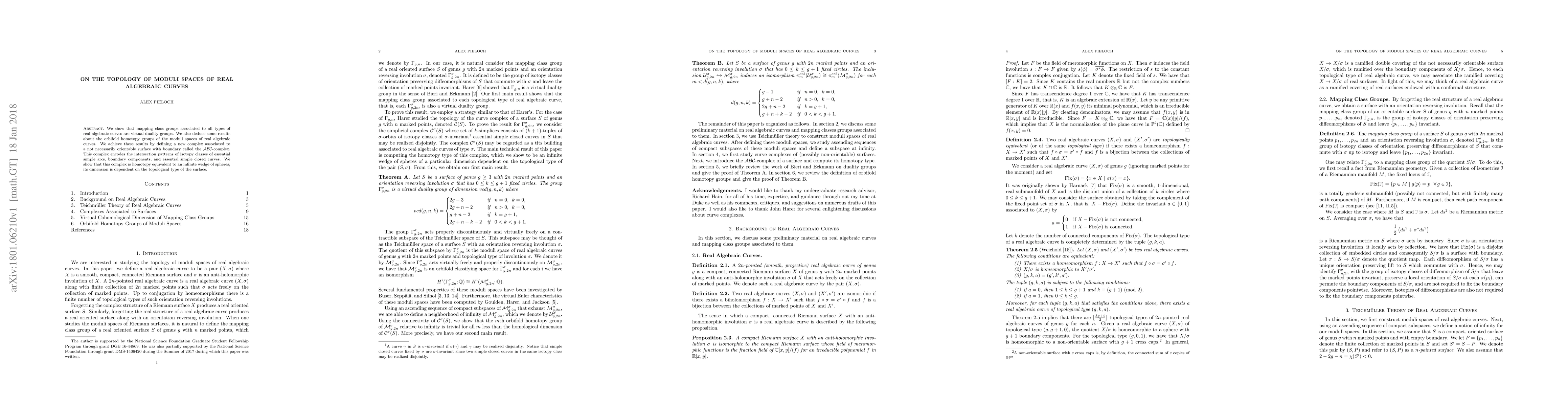 We show that mapping class groups associated to all types of real algebraic curves are virtual duality groups. We also deduce some results about the orbifold homotopy groups of the moduli spaces of real algebraic curves. We achieve these results by defining a new complex associated to a not necessarily orientable surface with boundary called the $\mathcal{A}\mathcal{B}\mathcal{C}$-complex. This complex encodes the intersection patterns of isotopy classes of essential simple arcs, boundary components, and essential simple closed curves. We show that this complex is homotopy equivalent to an infinite wedge of spheres; its dimension is dependent on the topological type of the surface.