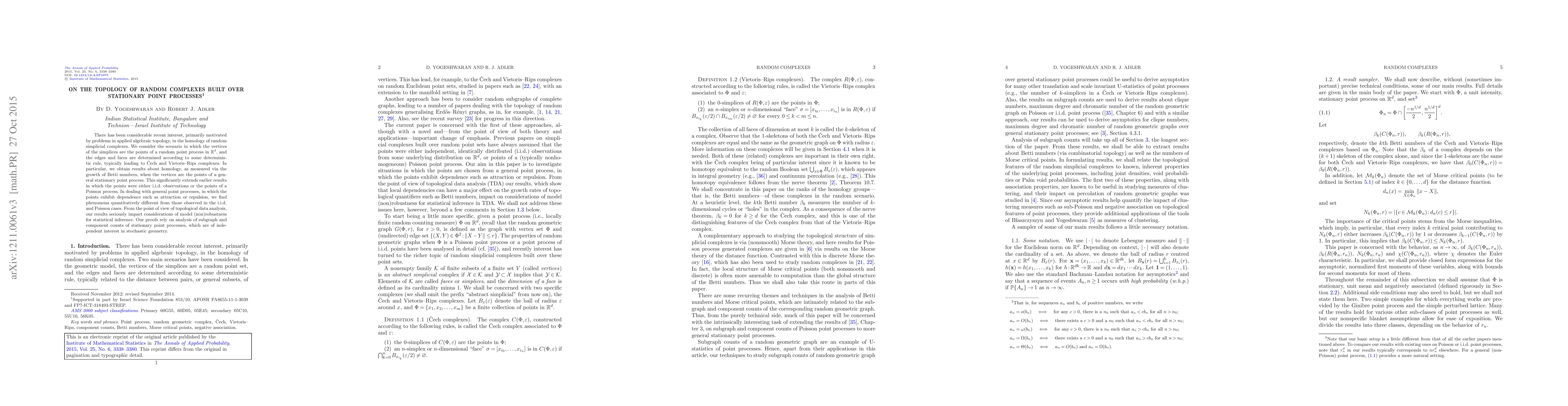 There has been considerable recent interest, primarily motivated by problems in applied algebraic topology, in the homology of random simplicial complexes. We consider the scenario in which the vertices of the simplices are the points of a random point process in $\mathbb {R}^d$, and the edges and faces are determined according to some deterministic rule, typically leading to \v{C}ech and Vietoris-Rips complexes. In particular, we obtain results about homology, as measured via the growth of Betti numbers, when the vertices are the points of a general stationary point process. This significantly extends earlier results in which the points were either i.i.d. observations or the points of a Poisson process. In dealing with general point processes, in which the points exhibit dependence such as attraction or repulsion, we find phenomena quantitatively different from those observed in the i.i.d. and Poisson cases. From the point of view of topological data analysis, our results seriously impact considerations of model (non)robustness for statistical inference. Our proofs rely on analysis of subgraph and component counts of stationary point processes, which are of independent interest in stochastic geometry.