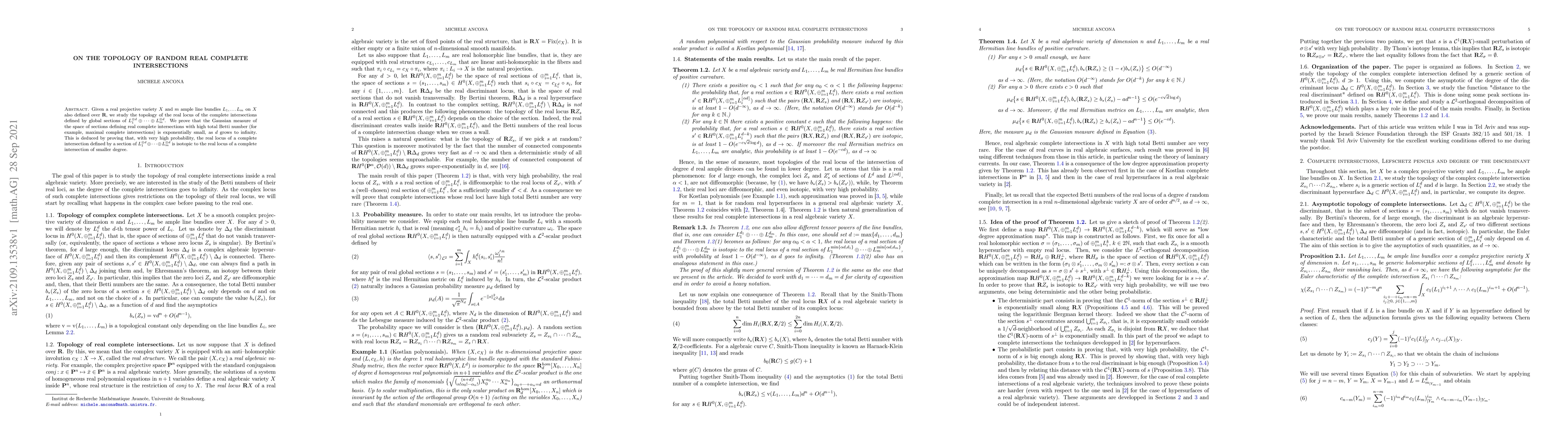 Given a real projective variety $X$ and $m$ ample line bundles $L_1,\dots L_m$ on $X$ also defined over $\mathbb{R}$, we study the topology of the real locus of the complete intersections defined by global sections of $L_1^{\otimes d}\oplus\cdots\oplus L^{\otimes d}_m$. We prove that the Gaussian measure of the space of sections defining real complete intersections with high total Betti number (for example, maximal complete intersections) is exponentially small, as $d$ grows to infinity. This is deduced by proving that, with very high probability, the real locus of a complete intersection defined by a section of $L_1^{\otimes d}\oplus\dots\oplus L^{\otimes d}_m$ is isotopic to the real locus of a complete intersection of smaller degree.