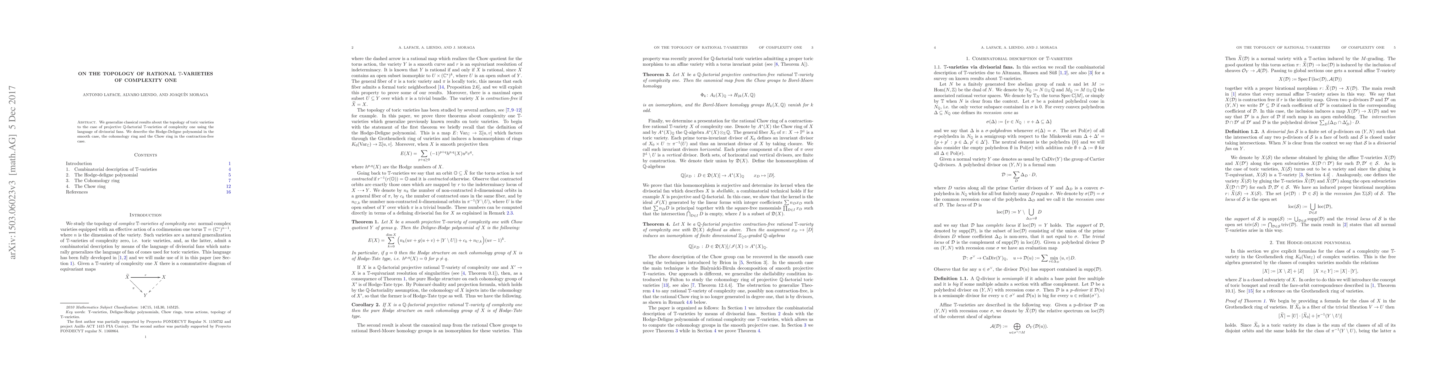 This paper generalizes classical topology results for toric varieties to projective Q-factorial T-varieties of complexity one, utilizing divisorial fans. It describes the Hodge-Deligne polynomial, cohomology ring, and Chow ring in the smooth and contraction-free scenarios.