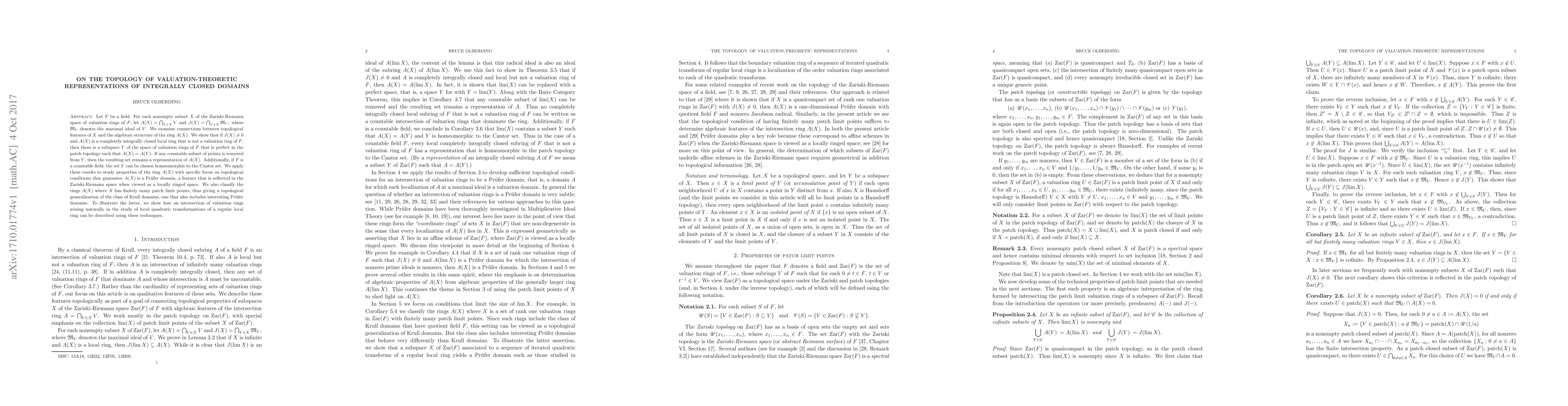 Let $F$ be a field. For each nonempty subset $X$ of the Zariski-Riemann space of valuation rings of $F$, let ${A}(X) = \bigcap_{V \in X}V$ and ${J}(X) = \bigcap_{V \in X}{\mathfrak M}_V$, where ${\mathfrak M}_V$ denotes the maximal ideal of $V$. We examine connections between topological features of $X$ and the algebraic structure of the ring ${A}(X)$. We show that if ${J}(X) \ne 0$ and $A(X)$ is a completely integrally closed local ring that is not a valuation ring of $F$, then there is a subspace $Y$ of the space of valuation rings of $F$ that is perfect in the patch topology such that ${A}(X) = {A}(Y)$. If any countable subset of points is removed from $Y$, then the resulting set remains a representation of $A(X)$. Additionally, if $F$ is a countable field, the set $Y$ can be chosen homeomorphic to the Cantor set. We apply these results to study properties of the ring ${A}(X)$ with specific focus on topological conditions that guarantee ${A}(X)$ is a Pr\"ufer domain, a feature that is reflected in the Zariski-Riemann space when viewed as a locally ringed space. We also classify the rings ${A}(X)$ where $X$ has finitely many patch limit points, thus giving a topological generalization of the class of Krull domains, one that also includes interesting Pr\"ufer domains. To illustrate the latter, we show how an intersection of valuation rings arising naturally in the study of local quadratic transformations of a regular local ring can be described using these techniques.