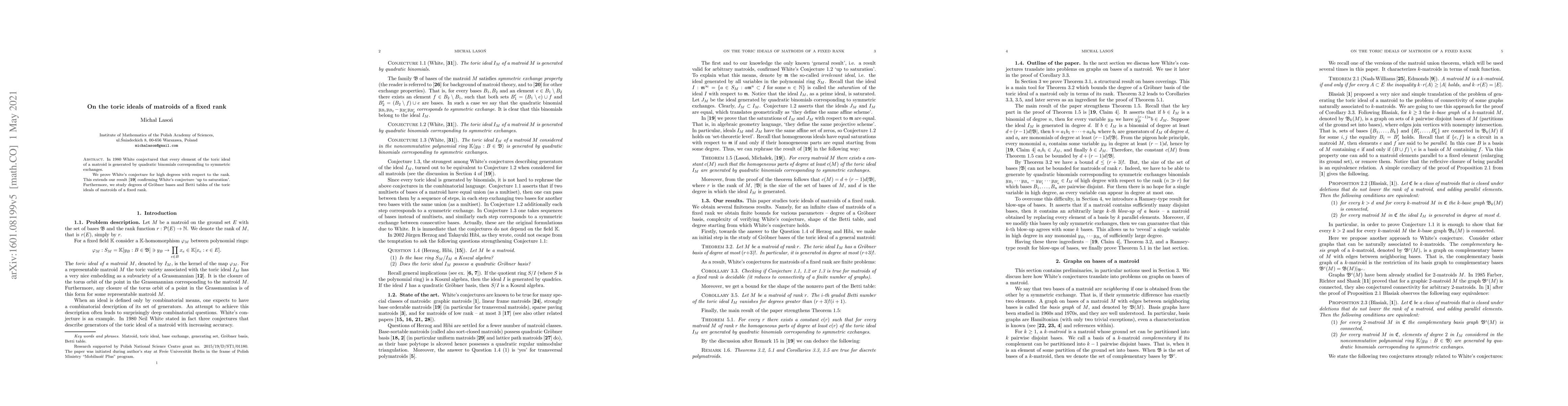 In $1980$ White conjectured that every element of the toric ideal of a matroid is generated by quadratic binomials corresponding to symmetric exchanges. We prove White's conjecture for high degrees with respect to the rank. This extends our result arXiv:1302.5236 confirming White's conjecture `up to saturation'. Furthermore, we study degrees of Gr\"{o}bner bases and Betti tables of the toric ideals of matroids of a fixed rank.