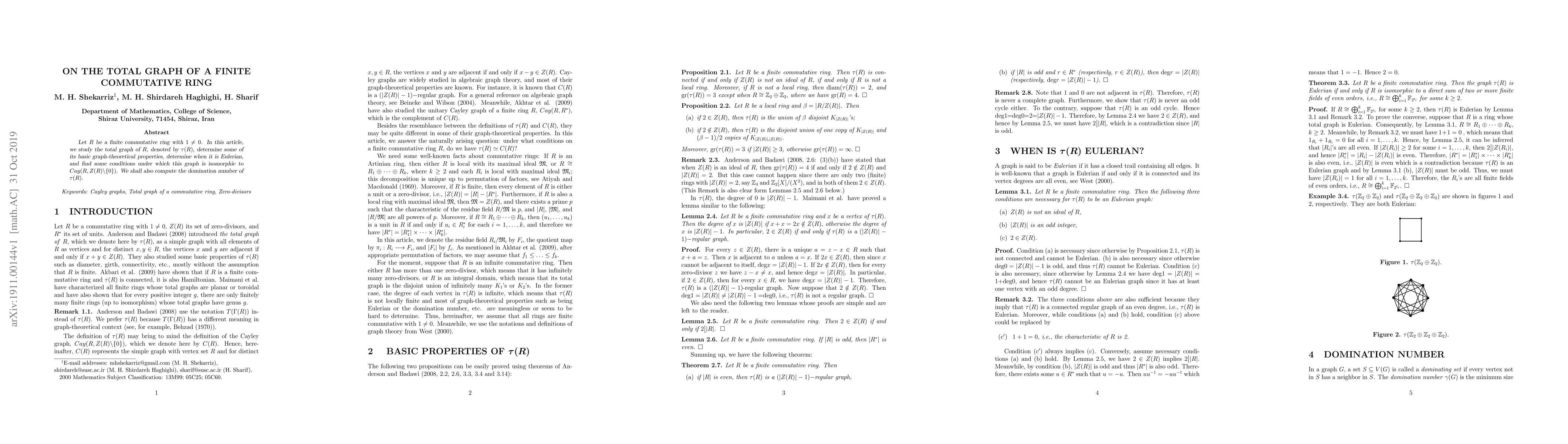 Let $R$ be a finite commutative ring with $1\ne 0$. In this article, we study the total graph of $R$, denoted by $\tau (R)$, determine some of its basic graph-theoretical properties, determine when it is Eulerian, and find some conditions under which this graph is isomorphic to $Cay(R,Z(R)\backslash\lbrace 0\rbrace)$. We shall also compute the domination number of $\tau (R).