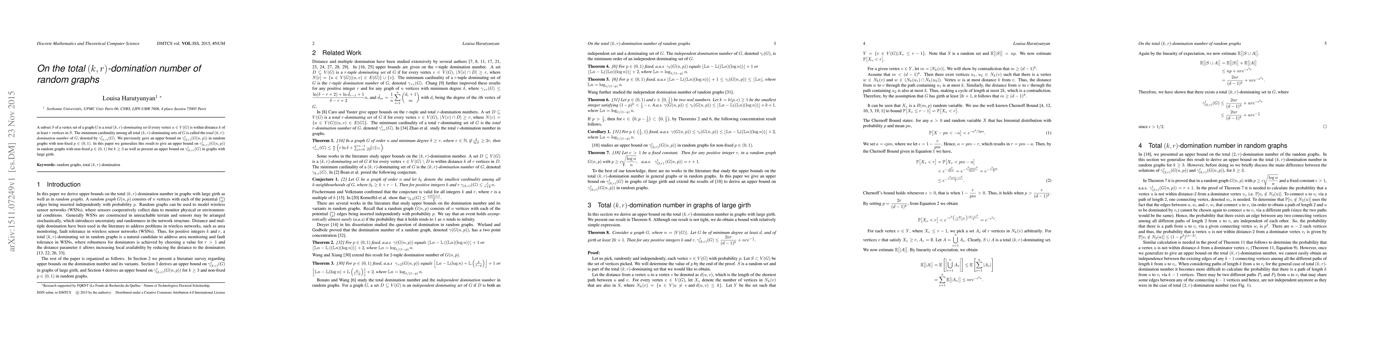The paper provides an upper bound on the total $(k,r)$-domination number of random graphs $G(n,p)$ for $k \geq 3$ and non-fixed $p \in (0,1)$, as well as an upper bound for graphs with large girth.