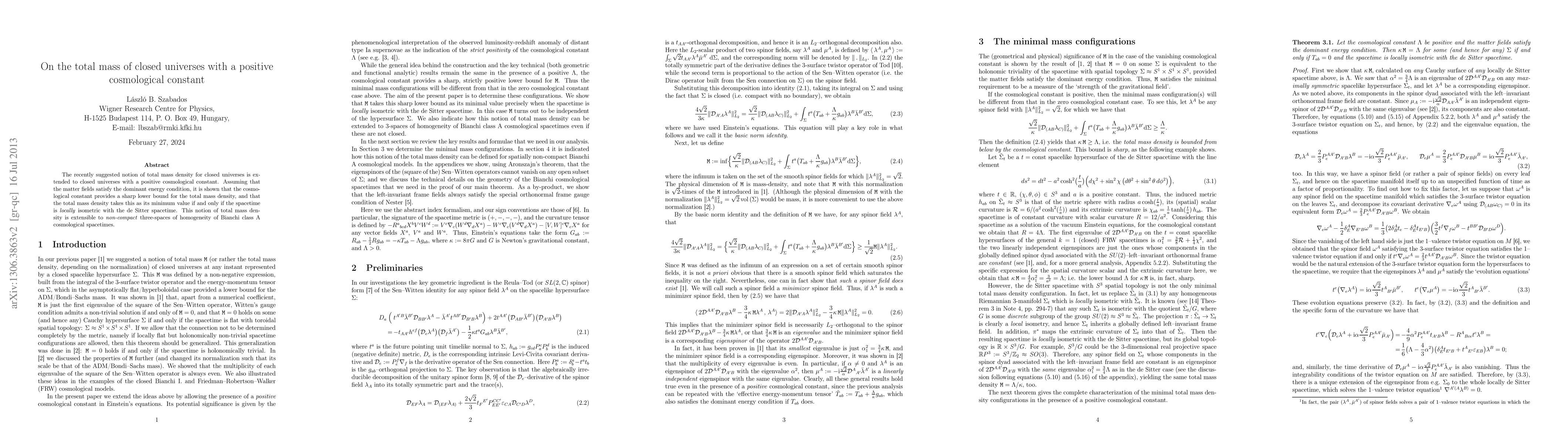 This paper extends the concept of total mass density to closed universes with a positive cosmological constant, demonstrating that the cosmological constant sets a strict lower bound for this density, which is only minimized when the spacetime is locally isometric to de Sitter spacetime. The notion of total mass density is also applicable to non-compact three-spaces in Bianchi class A cosmological models.