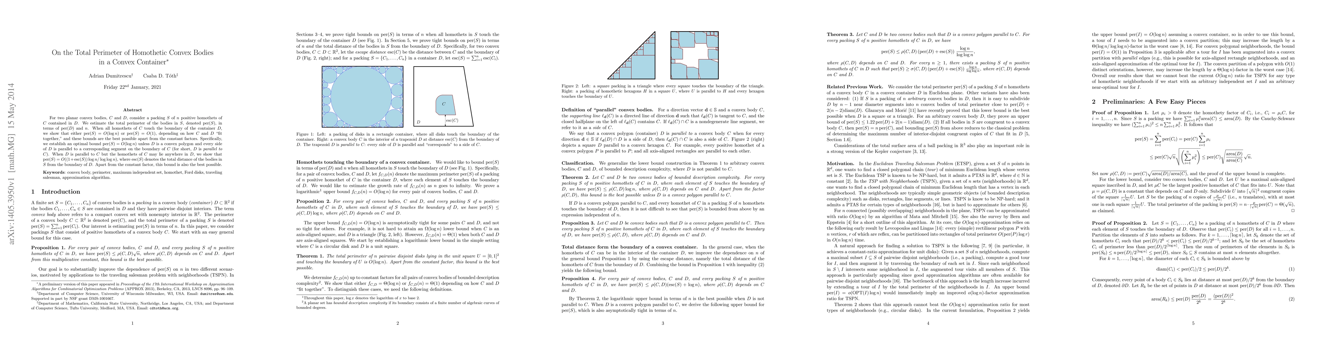 This paper investigates the total perimeter of a packing of homothetic convex bodies within a convex container, showing that the total perimeter is either $O(\log n)$ or $O(1)$ depending on the fit between the shapes, with optimal bounds established for various configurations. When the container is parallel to the shape being packed, a refined bound involving the escape distance is provided.