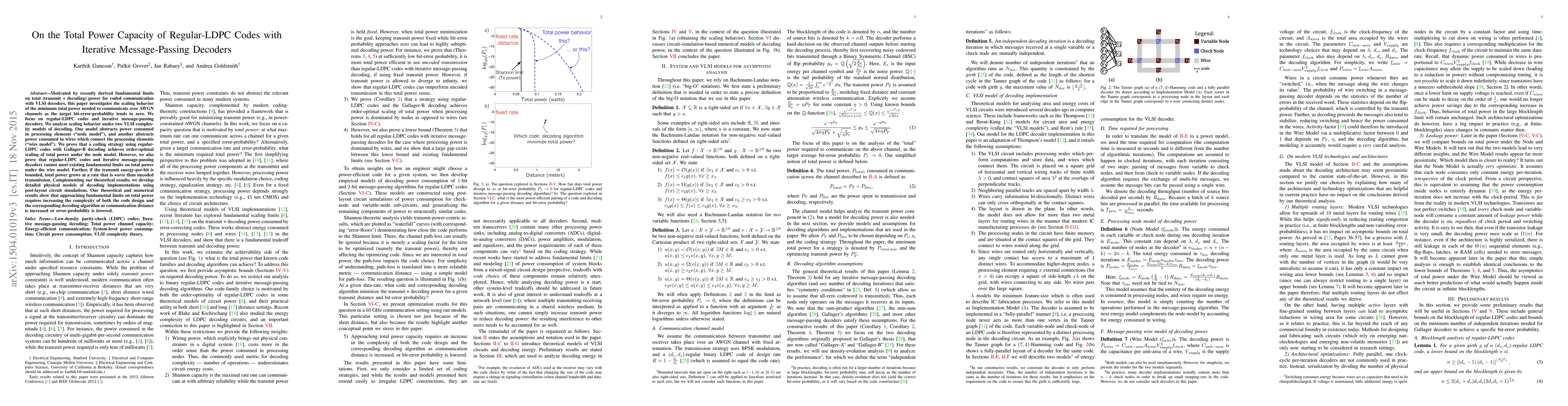 This paper explores the total power efficiency of regular-LDPC codes with iterative decoders over AWGN channels, proving order-optimal scaling under a node model but failing to meet fundamental limits under a wire model. It highlights the need for complex code and decoding strategies to approach power limits.