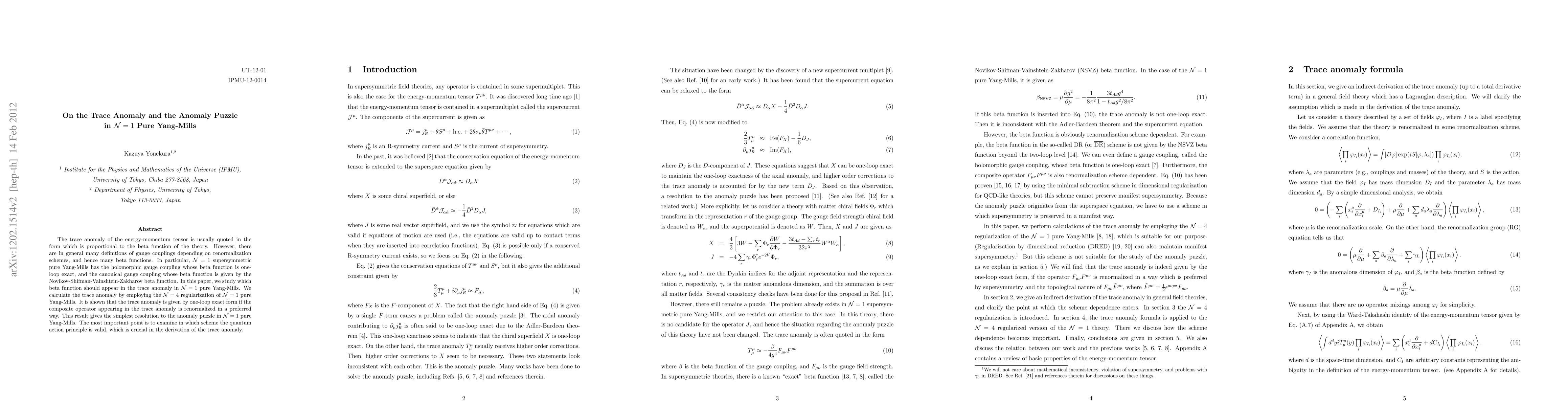 The trace anomaly of the energy-momentum tensor is usually quoted in the form which is proportional to the beta function of the theory. However, there are in general many definitions of gauge couplings depending on renormalization schemes, and hence many beta functions. In particular, N=1 supersymmetric pure Yang-Mills has the holomorphic gauge coupling whose beta function is one-loop exact, and the canonical gauge coupling whose beta function is given by the Novikov-Shifman-Vainshtein-Zakharov beta function. In this paper, we study which beta function should appear in the trace anomaly in N=1 pure Yang-Mills. We calculate the trace anomaly by employing the N=4 regularization of N=1 pure Yang-Mills. It is shown that the trace anomaly is given by one-loop exact form if the composite operator appearing in the trace anomaly is renormalized in a preferred way. This result gives the simplest resolution to the anomaly puzzle in N=1 pure Yang-Mills. The most important point is to examine in which scheme the quantum action principle is valid, which is crucial in the derivation of the trace anomaly.