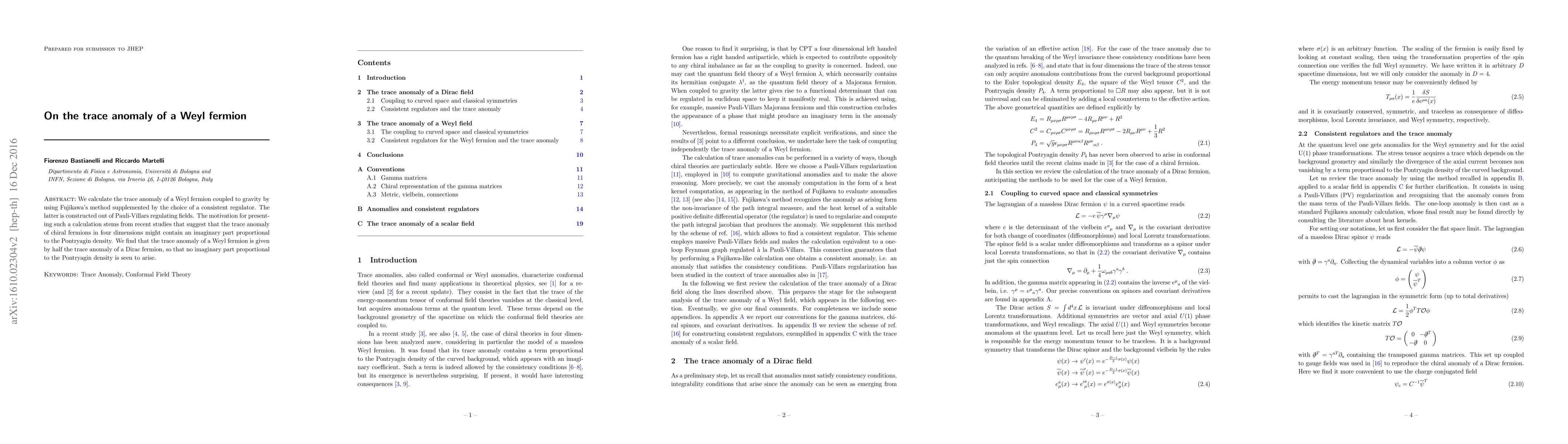 This paper calculates the trace anomaly of a Weyl fermion in a gravitational context using Fujikawa's method and Pauli-Villars regularization. It finds that the anomaly is half that of a Dirac fermion and does not include an imaginary part proportional to the Pontryagin density.