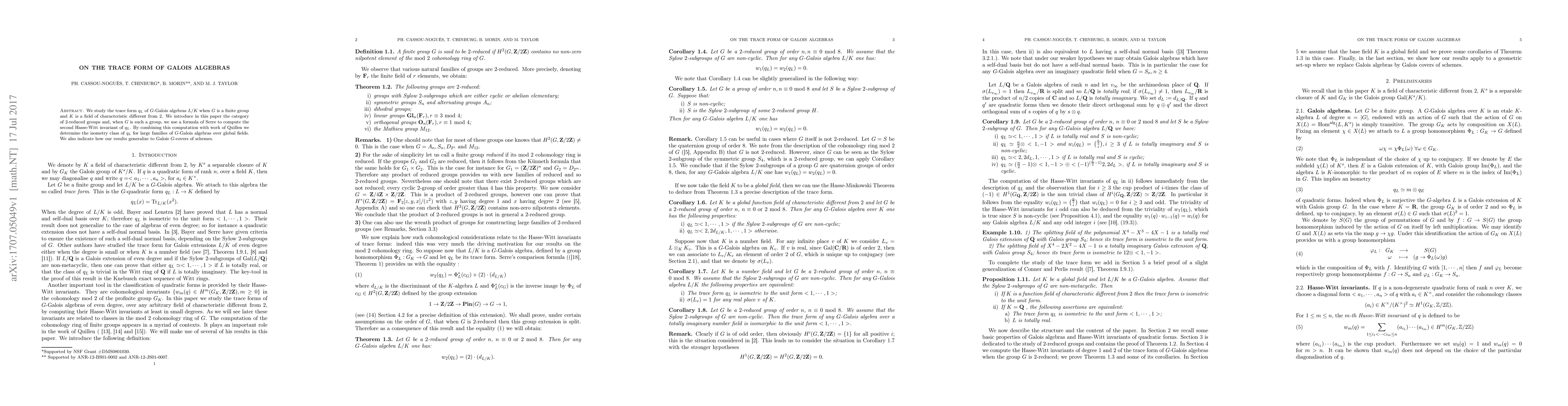 This paper investigates the trace form of G-Galois algebras, introducing the concept of 2-reduced groups to compute the second Hasse-Witt invariant using Serre's formula. The results determine the isometry class of these trace forms for extensive Galois algebra families over global fields, with implications for Galois G-covers of schemes.