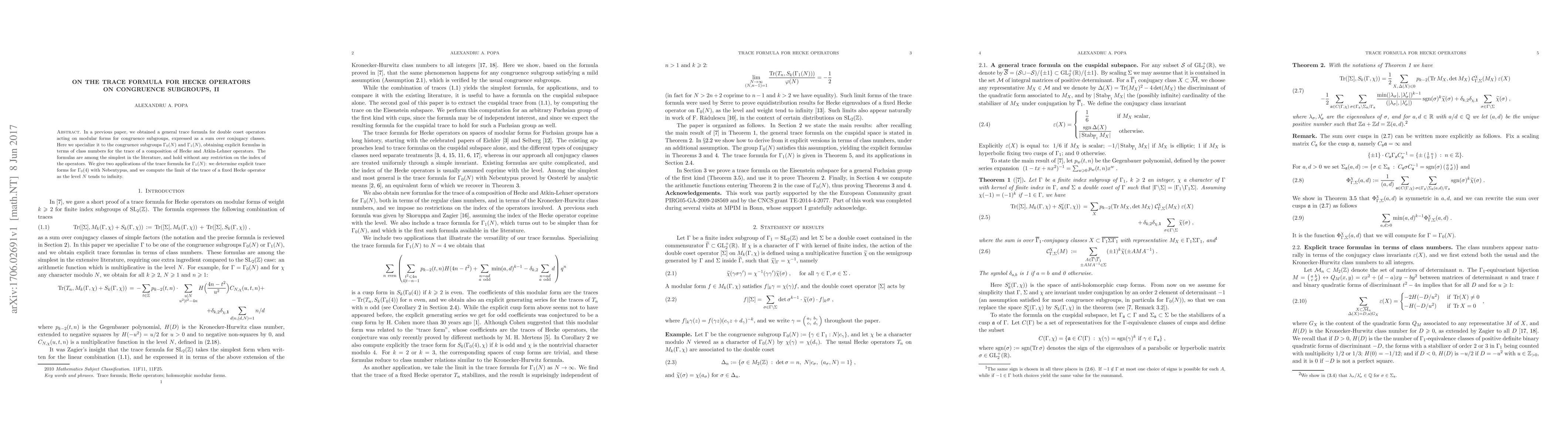 This paper derives explicit trace formulas for Hecke operators on specific congruence subgroups $\Gamma_0(N)$ and $\Gamma_1(N)$, providing simple expressions without level restrictions. It applies the formula to compute trace forms for $\Gamma_0(4)$ with Nebentypus and the limit of Hecke operator traces as the level $N$ approaches infinity.