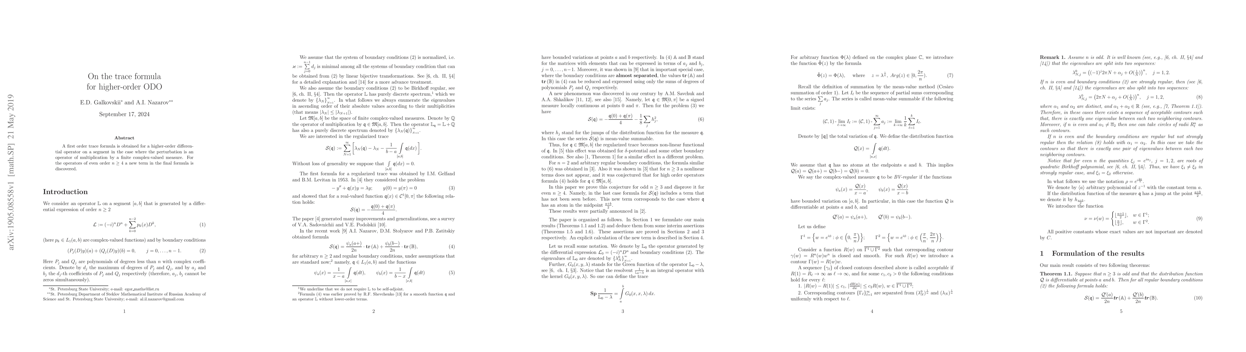 A first order trace formula is obtained for a higher-order differential operator on a segment in the case where the perturbation is an operator of multiplication by a finite complex-valued measure. For the operators of even order $n\ge4$ a new term in the final formula is discovered.