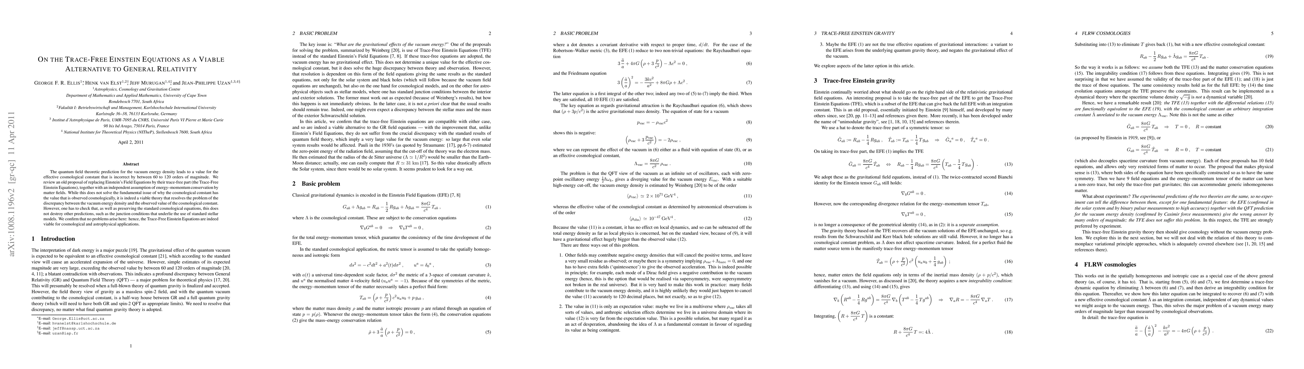 This paper proposes the Trace-Free Einstein Equations as an alternative to General Relativity to address the discrepancy between predicted and observed vacuum energy densities. It confirms that this alternative maintains standard cosmological and astrophysical predictions without compromising junction conditions.