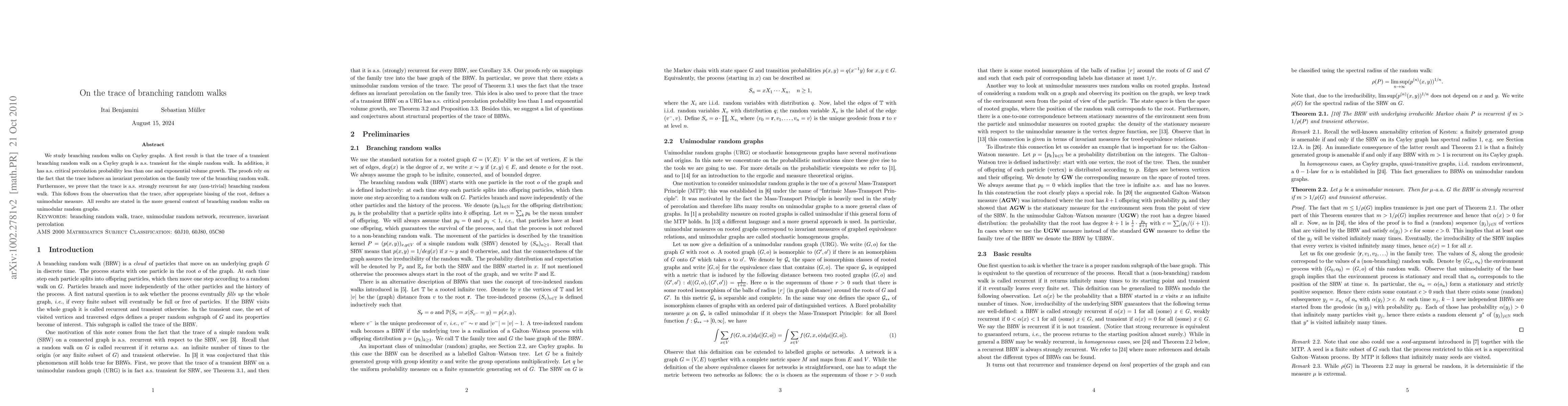 The paper introduces and leverages the concept of invariant percolation on the family tree of branching random walks to prove key results about the trace's properties on unimodular random graphs.