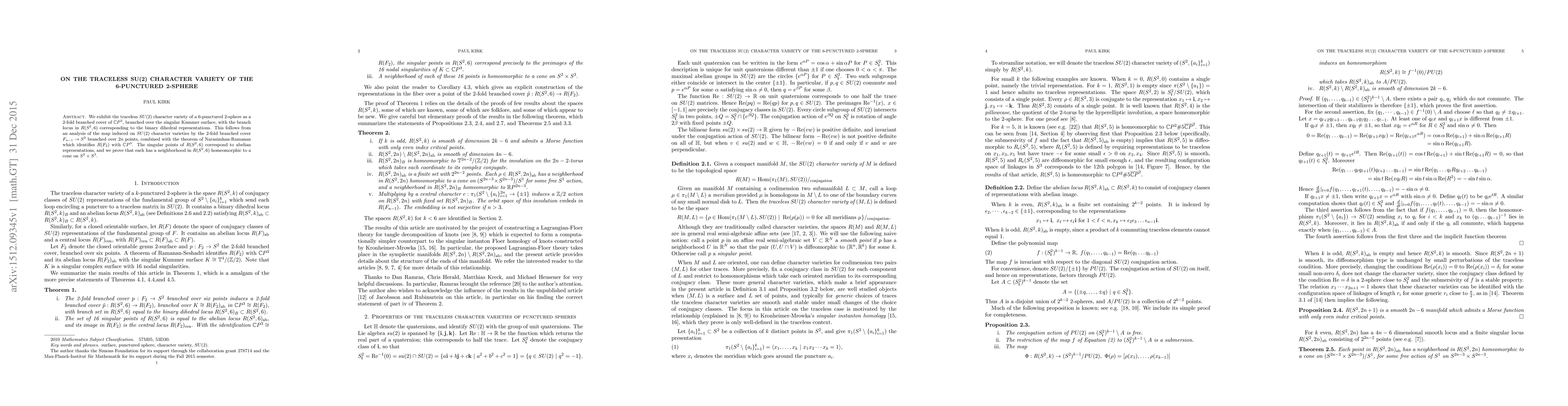 This paper explores the traceless $SU(2)$ character variety of a 6-punctured 2-sphere, revealing it as a 2-fold branched cover of ${\mathbb{C}}P^3$ over the singular Kummer surface. It utilizes Narasimhan-Ramanan's theorem and shows that singular points correspond to abelian representations, each having a neighborhood homeomorphic to a cone on $S^2\times S^3$.