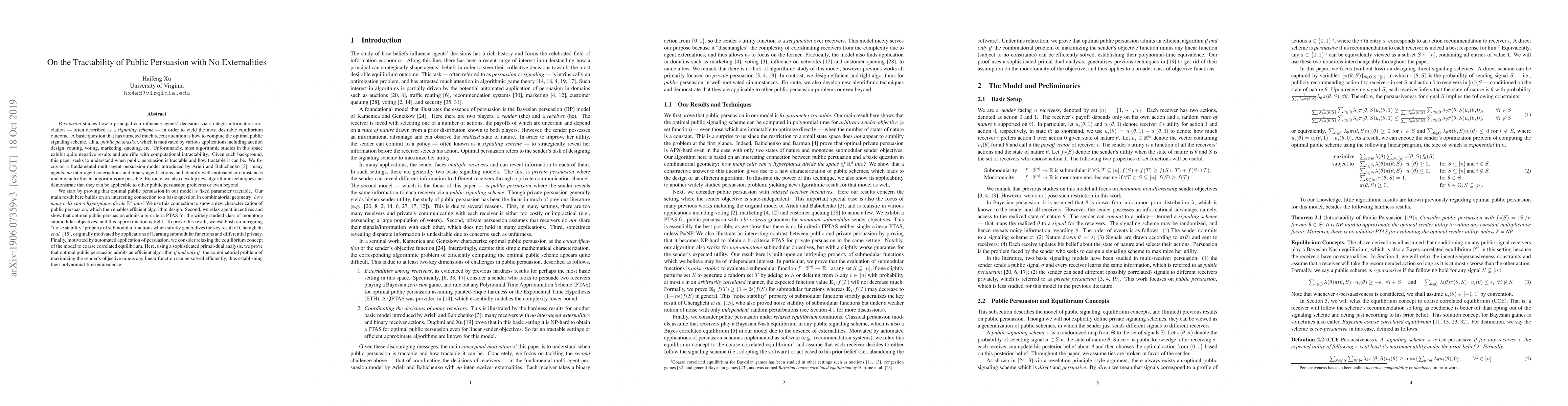 Persuasion studies how a principal can influence agents' decisions via strategic information revelation --- often described as a signaling scheme --- in order to yield the most desirable equilibrium outcome. Recently, there has been a large body of algorithmic study of designing optimal public signaling schemes, a.k.a., public persuasion, which however is rifle with computational intractability results. In this paper, we design efficient and tight algorithms for public persuasion, and focus on a fundamental multi-agent persuasion model with no inter-agent externalities and binary actions introduced by Arieli and Babichenko. En route, we develop new algorithmic techniques which may be of independent interests. First, we prove that optimal public persuasion is fixed parameter tractable. Our main result here relies on an interesting connection to a basic question in combinatorial geometry: how many cells can $n$ hyperplanes divide $R^d$ into? We use this connection to show a new characterization of public persuasion, which then enables efficient algorithm design. Second, we relax agent incentives and show that optimal public persuasion admits a bi-criteria PTAS for monotone submodular objectives and this approximation is tight. To prove this result, we establish an intriguing "noise stability" property of submodular functions which strictly generalizes the key result of Cheraghchi et al., originally motivated by applications of learning submodular functions and differential privacy. Finally, motivated by automated persuasion implemented as software, we consider relaxing the equilibrium concept of the model to coarse correlated equilibrium. Here we use a sophisticated primal-dual analysis to establish the polynomial-time equivalence between optimal public persuasion and the combinatorial problem of directly maximizing the sender's objective minus any linear function.