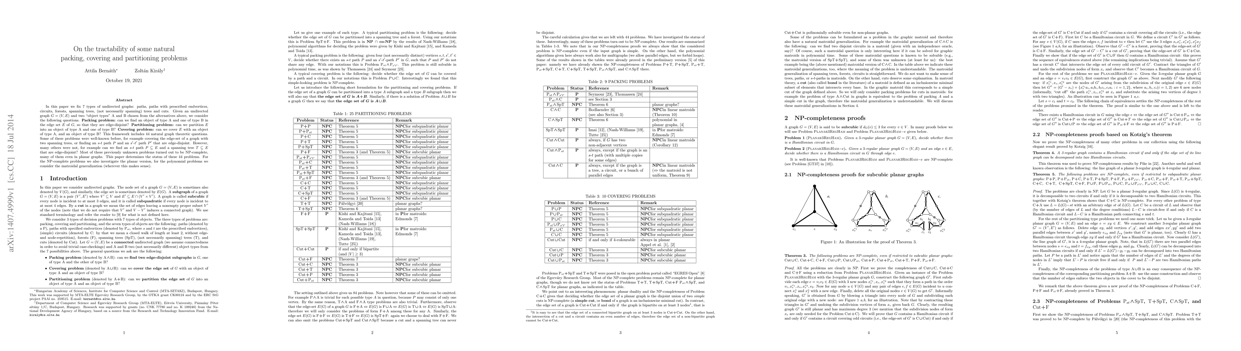 In this paper we fix 7 types of undirected graphs: paths, paths with prescribed endvertices, circuits, forests, spanning trees, (not necessarily spanning) trees and cuts. Given an undirected graph $G=(V,E)$ and two "object types" $\mathrm{A}$ and $\mathrm{B}$ chosen from the alternatives above, we consider the following questions. \textbf{Packing problem:} can we find an object of type $\mathrm{A}$ and one of type $\mathrm{B}$ in the edge set $E$ of $G$, so that they are edge-disjoint? \textbf{Partitioning problem:} can we partition $E$ into an object of type $\mathrm{A}$ and one of type $\mathrm{B}$? \textbf{Covering problem:} can we cover $E$ with an object of type $\mathrm{A}$, and an object of type $\mathrm{B}$? This framework includes 44 natural graph theoretic questions. Some of these problems were well-known before, for example covering the edge-set of a graph with two spanning trees, or finding an $s$-$t$ path $P$ and an $s'$-$t'$ path $P'$ that are edge-disjoint. However, many others were not, for example can we find an $s$-$t$ path $P\subseteq E $ and a spanning tree $T\subseteq E$ that are edge-disjoint? Most of these previously unknown problems turned out to be NP-complete, many of them even in planar graphs. This paper determines the status of these 44 problems. For the NP-complete problems we also investigate the planar version, for the polynomial problems we consider the matroidal generalization (wherever this makes sense).