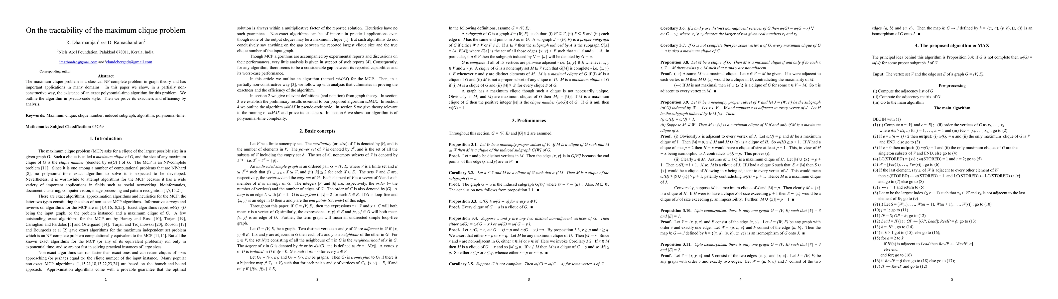 The maximum clique problem is a classical NP-complete problem in graph theory and has important applications in many domains. In this paper we show, in a partially non-constructive way, the existence of an exact polynomial-time algorithm for this problem. We outline the algorithm in pseudo-code style. Then we prove its exactness and efficiency by analysis.