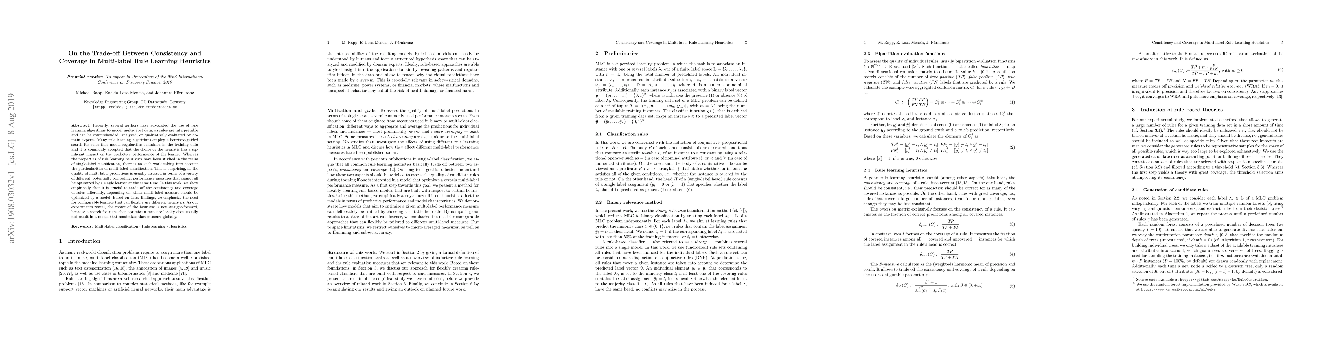 Researchers found that in multi-label classification, rules need to balance consistency and coverage based on the chosen performance measure. They emphasize the need for configurable learners to adapt different heuristics.