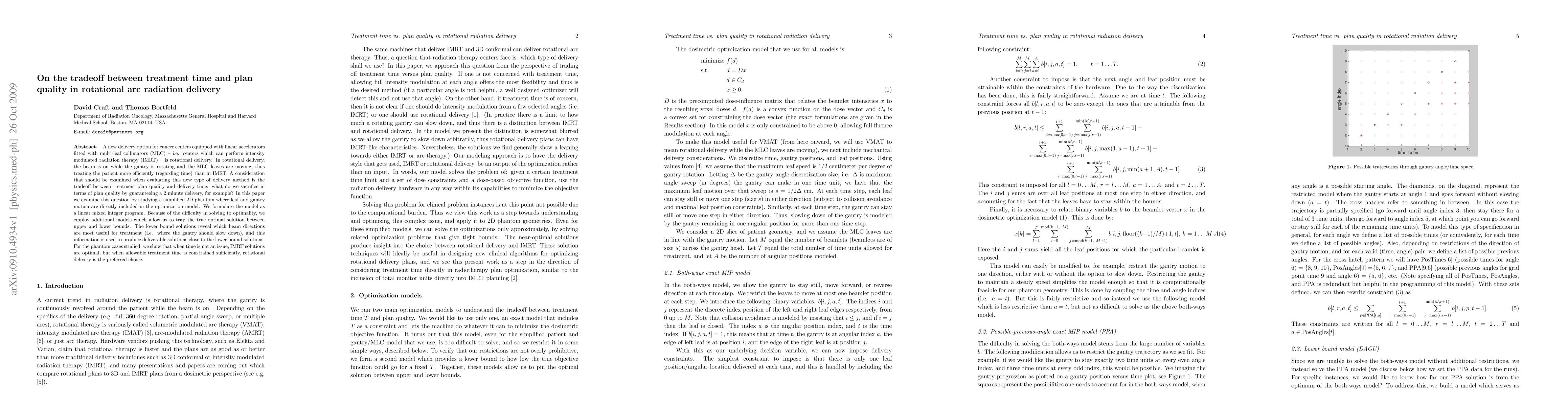 This paper investigates the tradeoff between treatment time and plan quality in rotational arc radiation delivery compared to intensity modulated radiation therapy (IMRT). It finds that while IMRT provides optimal plan quality, rotational delivery is more efficient in terms of time, but at the cost of some plan quality, which is analyzed using a simplified 2D phantom and linear mixed integer programming.