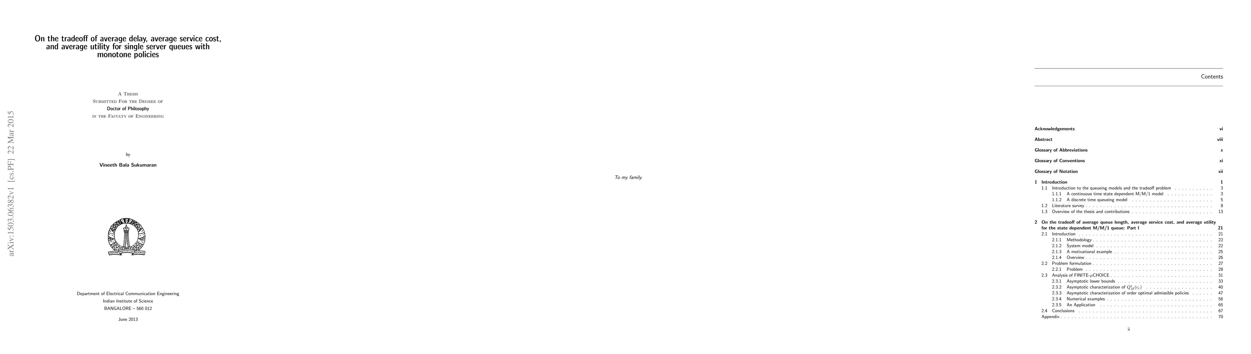 In this thesis, we study the optimal tradeoff of average delay, average service cost, and average utility for single server queueing models, with and without admission control. The continuous time and discrete time queueing models that we consider are motivated by cross-layer models for noisy point-to-point links, with random packet arrivals. We study the above tradeoff problem for a class of admissible policies, which are monotone and stationary and obtain an asymptotic characterization of the minimum average delay as a function of the average service cost and average utility constraints.