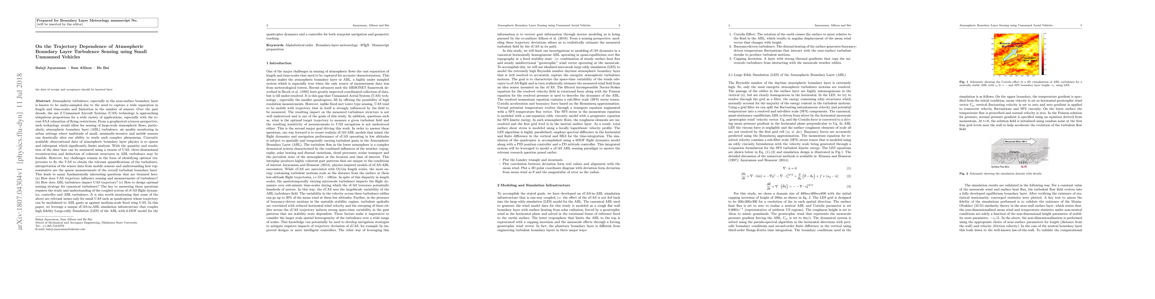 Atmospheric turbulence, especially in the near-surface boundary layer is known to be under-sampled due to the need to capture a wide separation in length and time-scales and limitation in the number of sensors. Over the past decade, the use if Unmanned Aircraft Systems (UAS) technology is approaching ubiquitous proportions for a wide variety of applications, especially with the recent FAA relaxation of flying restrictions. From a geophysical sciences perspective, such technology would allow for sensing of large-scale atmospheric flows, particularly, atmospheric boundary layer (ABL) turbulence, air quality monitoring in urban settings where multitude of small, minimally-invasive and mobile sensors can drastically alter our ability to study such complex phenomena. Currently available observational data of atmospheric boundary layer physics is so sparse and infrequent which significantly limits analysis. With the quantity and resolution of the data that can be measured using a swarm of UAS, three-dimensional reconstruction and deduction of coherent structures in ABL turbulence may be feasible. However, key challenges remain in the form of identifying optimal trajectories to fly the UAS to obtain the relevant quantifications of the turbulence, interpretation of the sensor data from mobile sensors and understanding how representative are the sparse measurements of the overall turbulent boundary layer. This leads to many fundamentally interesting questions if which a few are explored in this article.