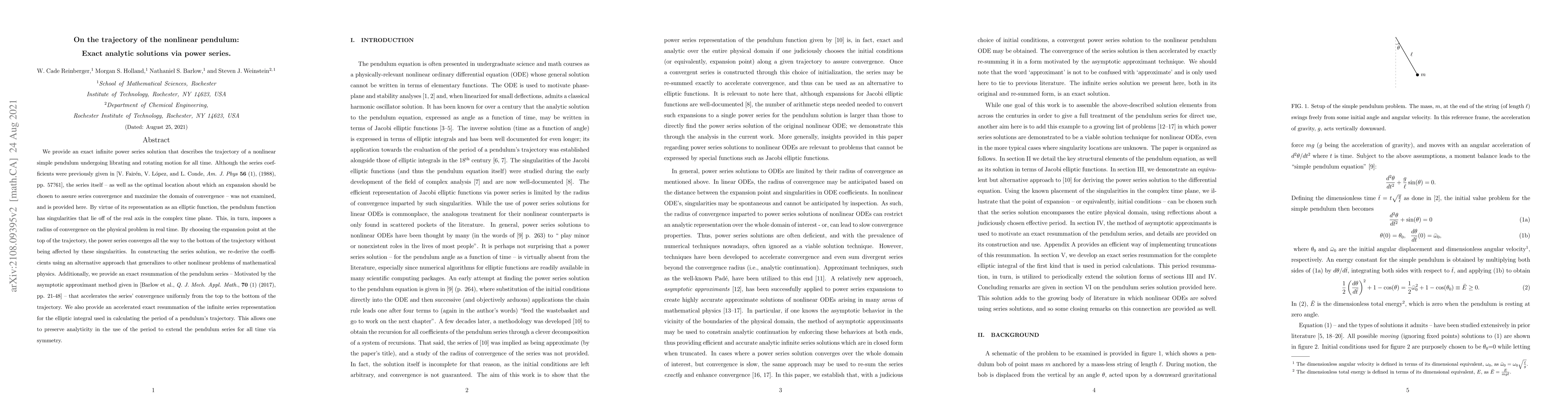 We provide an exact infinite power series solution that describes the trajectory of a nonlinear simple pendulum undergoing librating and rotating motion for all time. Although the series coefficients were previously given in [V. Fair\'en, V. L\'opez, and L. Conde, Am. J. Phys 56 (1), (1988), pp. 57-61], the series itself -- as well as the optimal location about which an expansion should be chosen to assure series convergence and maximize the domain of convergence -- was not examined, and is provided here. By virtue of its representation as an elliptic function, the pendulum function has singularities that lie off of the real axis in the complex time plane. This, in turn, imposes a radius of convergence on the physical problem in real time. By choosing the expansion point at the top of the trajectory, the power series converges all the way to the bottom of the trajectory without being affected by these singularities. In constructing the series solution, we re-derive the coefficients using an alternative approach that generalizes to other nonlinear problems of mathematical physics. Additionally, we provide an exact resummation of the pendulum series -- Motivated by the asymptotic approximant method given in [Barlow et al., Q. J. Mech. Appl. Math., 70 (1) (2017), pp. 21-48] -- that accelerates the series' convergence uniformly from the top to the bottom of the trajectory. We also provide an accelerated exact resummation of the infinite series representation for the elliptic integral used in calculating the period of a pendulum's trajectory. This allows one to preserve analyticity in the use of the period to extend the pendulum series for all time via symmetry.