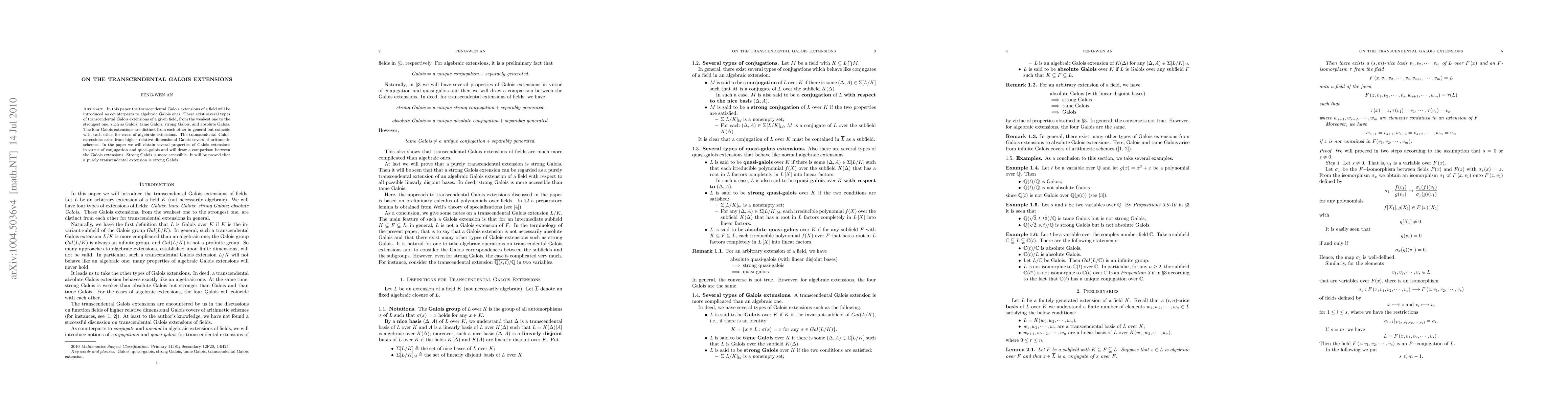 In this paper the transcendental Galois extensions of a field will be introduced as counterparts to algebraic Galois ones. There exist several types of transcendental Galois extensions of a given field, from the weakest one to the strongest one, such as Galois, tame Galois, strong Galois, and absolute Galois. The four Galois extensions are distinct from each other in general but coincide with each other for cases of algebraic extensions. The transcendental Galois extensions arise from higher relative dimensional Galois covers of arithmetic schemes. In the paper we will obtain several properties of Galois extensions in virtue of conjugation and quasi-galois and will draw a comparison between the Galois extensions. Strong Galois is more accessible. It will be proved that a purely transcendental extension is strong Galois.
