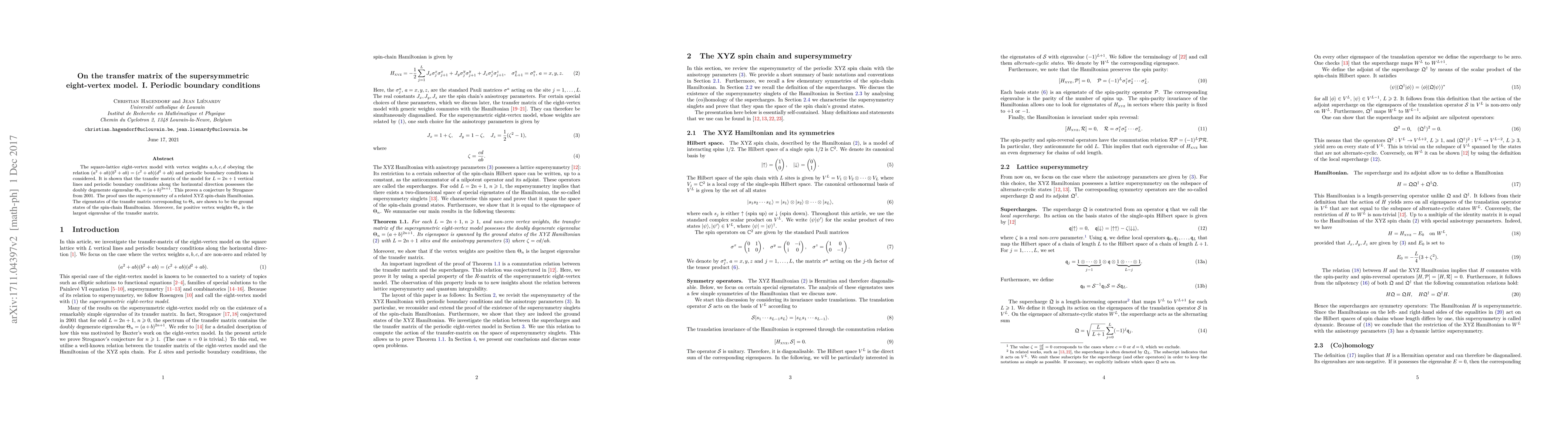 Researchers prove a conjecture from 2001 about the eight-vertex model, showing that its transfer matrix has a specific eigenvalue structure with doubly degenerate values. The proof uses supersymmetry in a related spin-chain Hamiltonian.