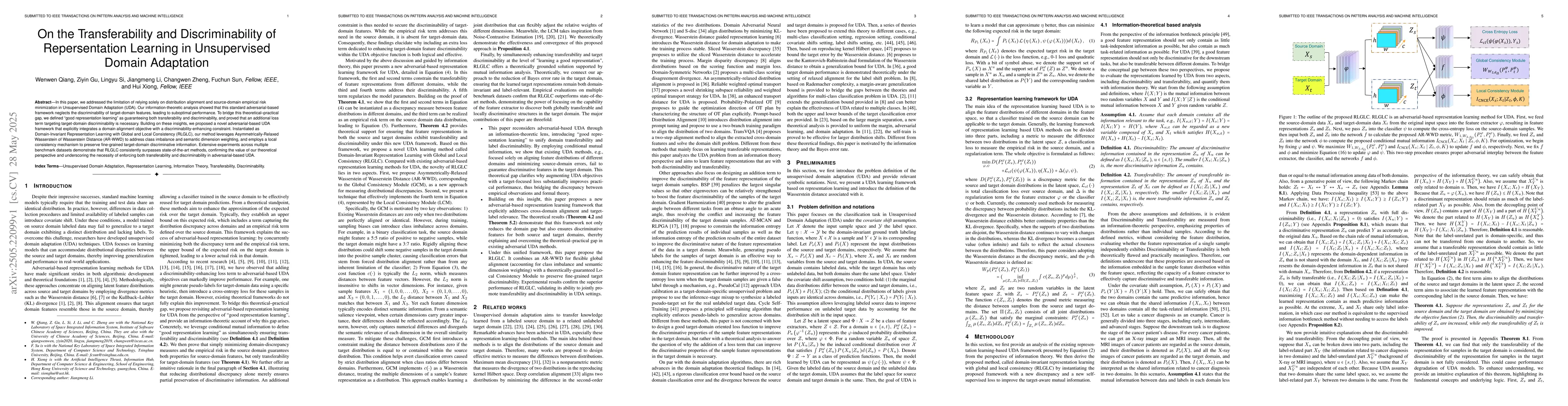 In this paper, we addressed the limitation of relying solely on distribution alignment and source-domain empirical risk minimization in Unsupervised Domain Adaptation (UDA). Our information-theoretic analysis showed that this standard adversarial-based framework neglects the discriminability of target-domain features, leading to suboptimal performance. To bridge this theoretical-practical gap, we defined "good representation learning" as guaranteeing both transferability and discriminability, and proved that an additional loss term targeting target-domain discriminability is necessary. Building on these insights, we proposed a novel adversarial-based UDA framework that explicitly integrates a domain alignment objective with a discriminability-enhancing constraint. Instantiated as Domain-Invariant Representation Learning with Global and Local Consistency (RLGLC), our method leverages Asymmetrically-Relaxed Wasserstein of Wasserstein Distance (AR-WWD) to address class imbalance and semantic dimension weighting, and employs a local consistency mechanism to preserve fine-grained target-domain discriminative information. Extensive experiments across multiple benchmark datasets demonstrate that RLGLC consistently surpasses state-of-the-art methods, confirming the value of our theoretical perspective and underscoring the necessity of enforcing both transferability and discriminability in adversarial-based UDA.