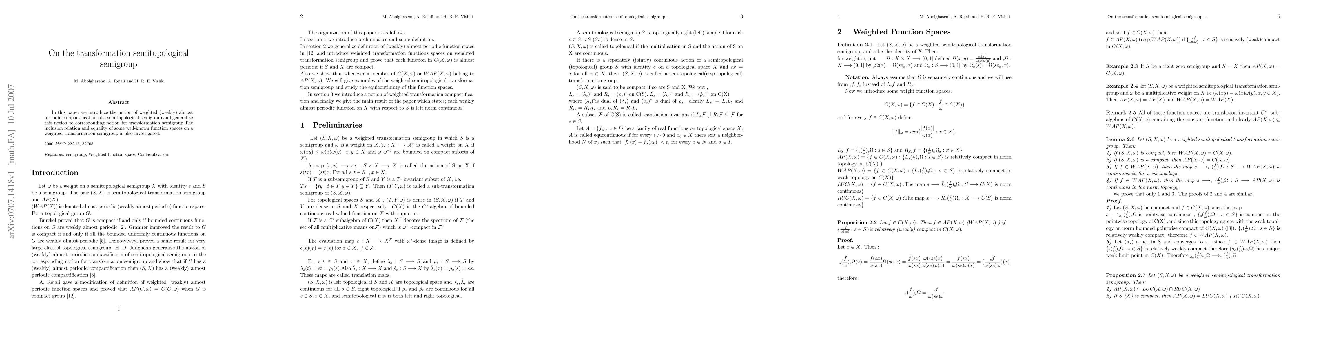 In this paper we introduce the notion of weighted (weakly) almost periodic compactifcation of a semitopological semigroup and generalize this notion to corresponding notion for transformation semigroup.The inclusion relation and equality of some well known function spaces on a weighted transformation semigroup is also investigated.
