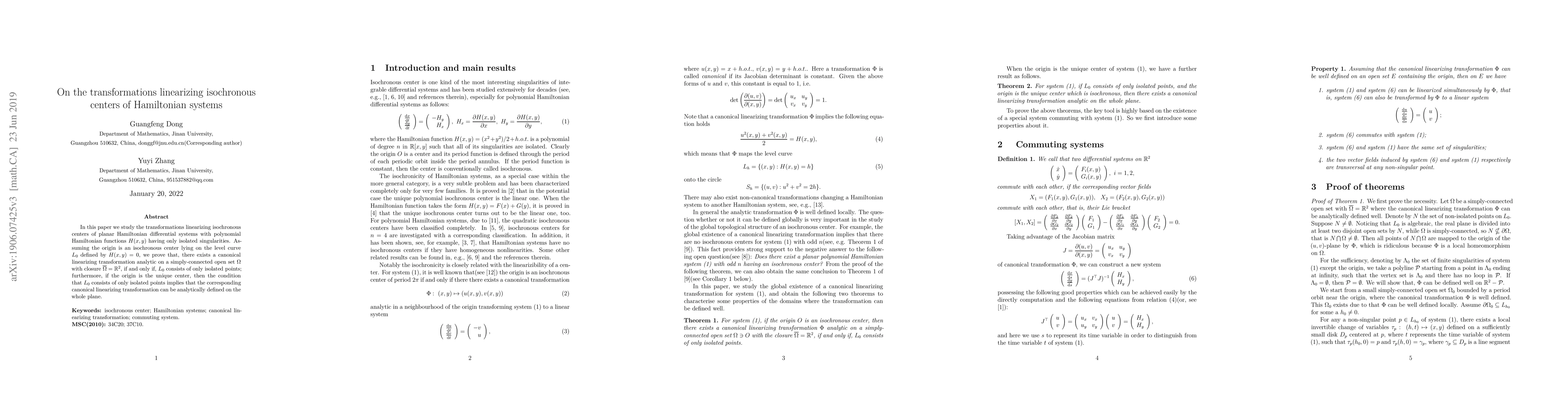 This paper investigates transformations that linearize isochronous centers in planar Hamiltonian systems with polynomial Hamiltonians. It proves the existence of a canonical linearizing transformation if the level curve at the origin consists solely of isolated points, and if the origin is the unique center, this transformation can be analytically defined throughout the entire plane.