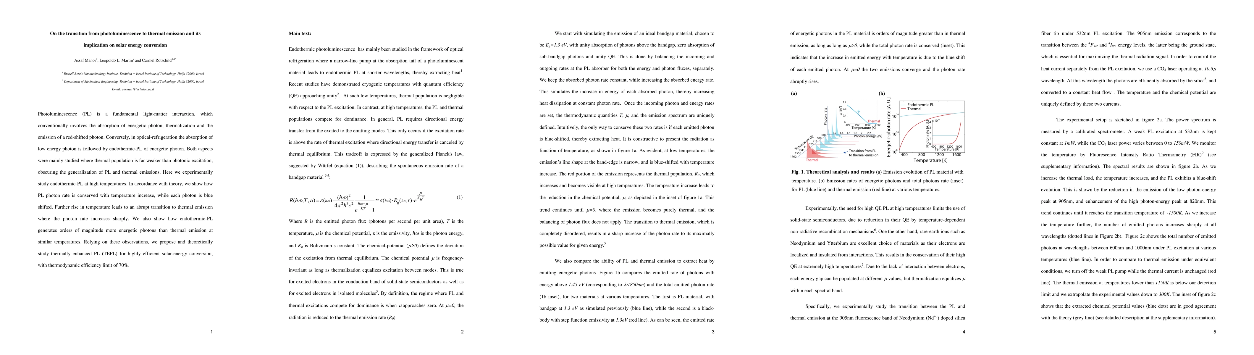 Photoluminescence (PL) is a fundamental light-matter interaction, which conventionally involves the absorption of energetic photon, thermalization and the emission of a red-shifted photon. Conversely, in optical-refrigeration the absorption of low energy photon is followed by endothermic-PL of energetic photon. Both aspects were mainly studied where thermal population is far weaker than photonic excitation, obscuring the generalization of PL and thermal emissions. Here we experimentally study endothermic-PL at high temperatures. In accordance with theory, we show how PL photon rate is conserved with temperature increase, while each photon is blue shifted. Further rise in temperature leads to an abrupt transition to thermal emission where the photon rate increases sharply. We also show how endothermic-PL generates orders of magnitude more energetic photons than thermal emission at similar temperatures. Relying on these observations, we propose and theoretically study thermally enhanced PL (TEPL) for highly efficient solar-energy conversion, with thermodynamic efficiency limit of 70%.
