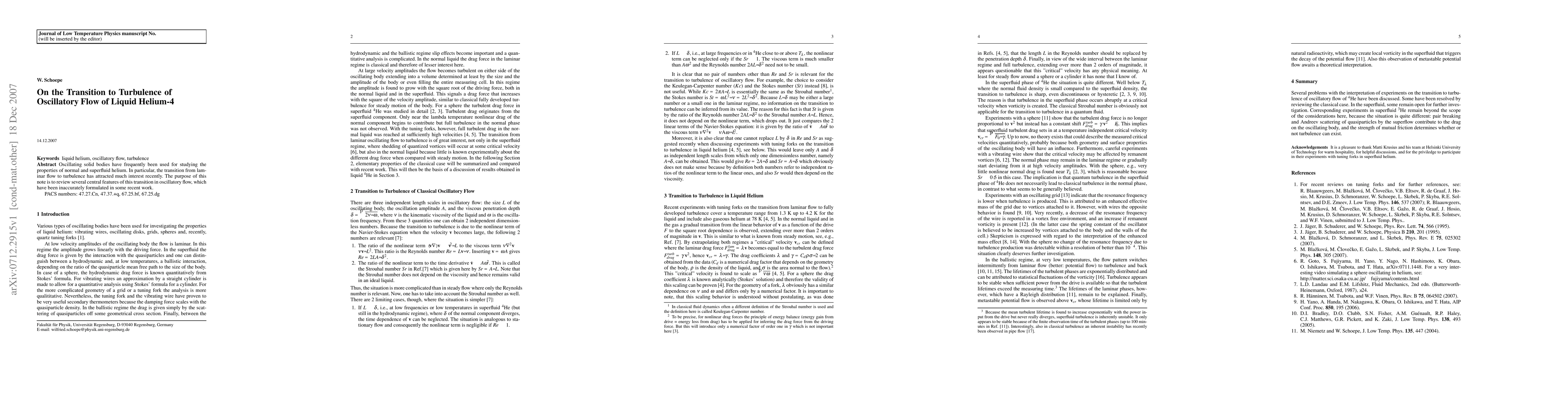 This paper reviews the transition from laminar to turbulent flow in oscillatory liquid helium-4, correcting inaccuracies in recent studies on this phenomenon. It highlights key features of the transition process in oscillating solid bodies.