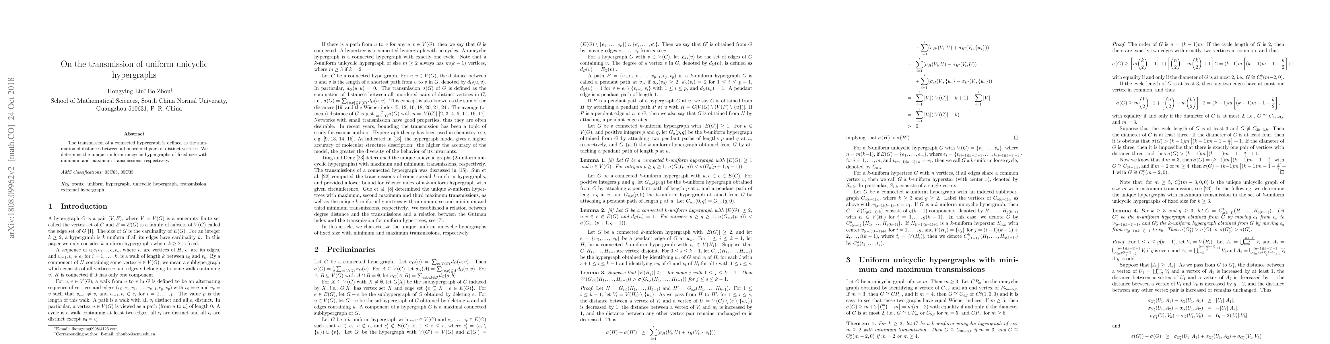 The transmission of a connected hypergraph is defined as the summation of distances between all unordered pairs of distinct vertices. We determine the unique uniform unicyclic hypergraphs of fixed size with minimum and maximum transmissions, respectively.