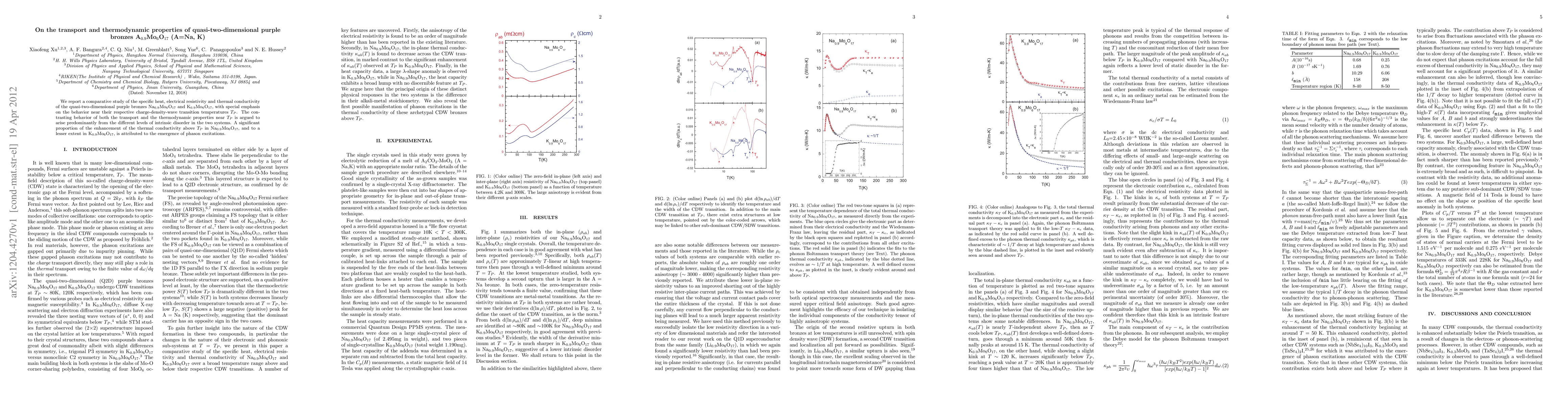 We report a comparative study of the specific heat, electrical resistivity and thermal conductivity of the quasi-two-dimensional purple bronzes Na$_{0.9}$Mo$_6$O$_{17}$ and K$_{0.9}$Mo$_6$O$_{17}$, with special emphasis on the behavior near their respective charge-density-wave transition temperatures $T_P$. The contrasting behavior of both the transport and the thermodynamic properties near $T_P$ is argued to arise predominantly from the different levels of intrinsic disorder in the two systems. A significant proportion of the enhancement of the thermal conductivity above $T_P$ in Na$_{0.9}$Mo$_6$O$_{17}$, and to a lesser extent in K$_{0.9}$Mo$_6$O$_{17}$, is attributed to the emergence of phason excitations.