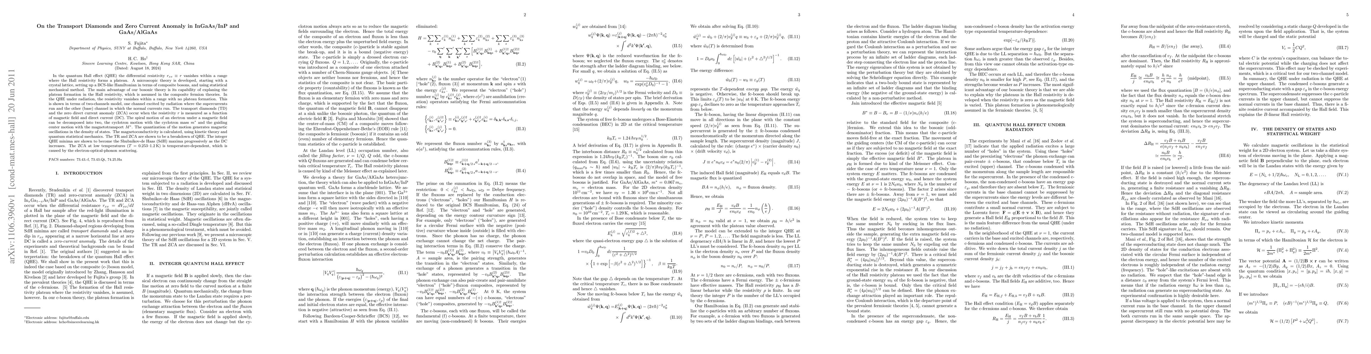 In the quantum Hall effect (QHE) the differential resistivity $r_{xx} \equiv r$ vanishes within a range where the Hall resistivity forms a plateau. A microscopic theory is developed, starting with a crystal lattice, setting up a BCS-like Hamiltonian in terms of composite bosons, and using statistical mechanical method. The main advantage of our bosonic theory is its capability of explaning the plateau formation in the Hall resistivity, which is assumed in the composite fermion theories. In the QHE under radiation, the resistivity vanishes within a range with no plateau formation. This is shown in terms of two-channels model, one channel excited by radiation where the supercurrents run and the other (base) channel in which the normal currents run. The transport diamonds (TD) and the zero direct current anomaly (ZCA) occur when the resistivity $r$ is measured as a function of magnetic field and direct current (DC). The spiral motion of an electron under a magnetic field can be decomposed into two, the cyclotron motion with the cyclotron mass $m^*$ and the guiding center motion with the magnetotransport $M^*$. The quantization of the motion generates magnetic oscillations in the density of states. The magnetoconductivity is calculated, using kinetic theory and quantum statistical mechanics. The TR and ZCA are shown to be a breakdown of QHE. The integer QHE minima are shown to become the Shubnikov-de Haas (SdH) maxima progressively as the DC increases. The ZCA at low temperatures ($T=0.253$--1.2\,K) is temperature-dependent, which is caused by the electron-optical-phonon scattering.