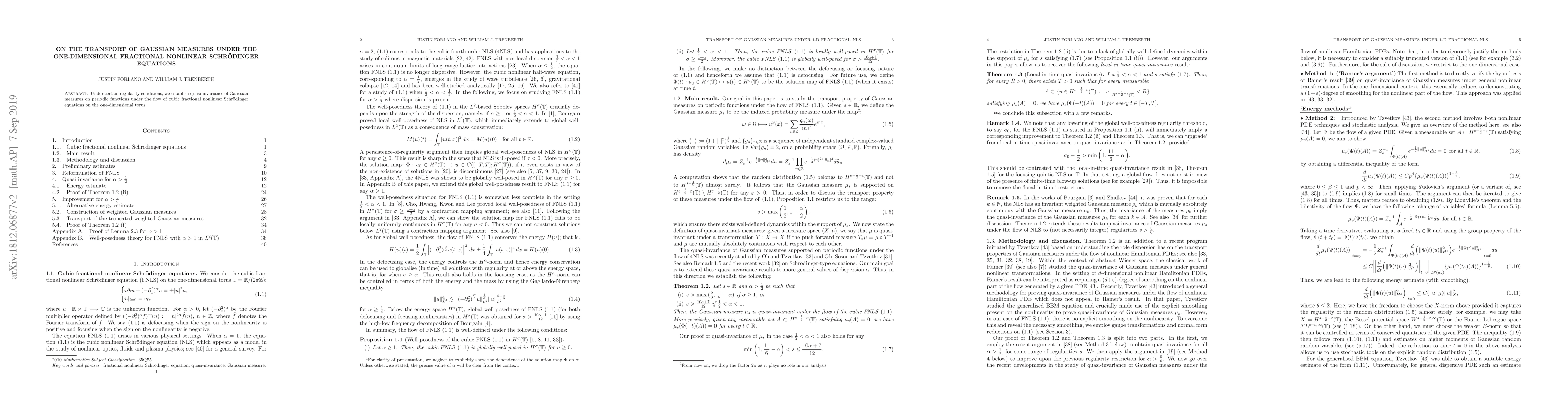 This paper establishes that Gaussian measures on periodic functions remain quasi-invariant under the flow of cubic fractional nonlinear Schr"{o}dinger equations on the one-dimensional torus.