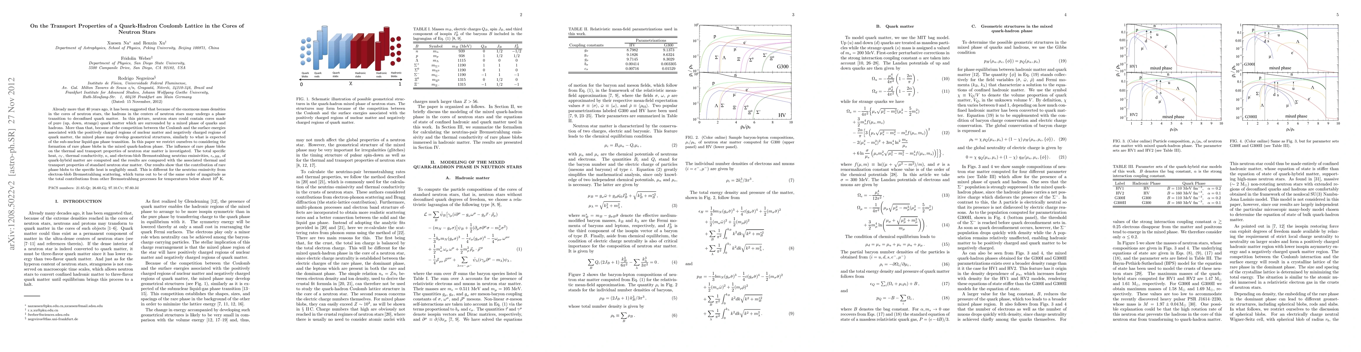 Already more that 40 years ago, it has been suggested that because of the enormous mass densities in the cores of neutron stars, the hadrons in the centers of neutron stars may undergo a phase transition to deconfined quark matter. In this picture, neutron stars could contain cores made of pure (up, down, strange) quark matter which are surrounded by a mixed phase of quarks and hadrons. More than that, because of the competition between the Coulomb and the surface energies associated with the positively charged regions of nuclear matter and negatively charged regions of quark matter, the mixed phase may develop geometrical structures, similarly to what is expected of the sub-nuclear liquid-gas phase transition. In this paper we restrict ourselves to considering the formation of rare phase blobs in the mixed quark-hadron phase. The influence of rare phase blobs on the thermal and transport properties of neutron star matter is investigated. The total specific heat, $c_V$, thermal conductivity, $\kappa$, and electron-blob Bremsstrahlung neutrino emissivities, $\epsilon_{\nu,\text{BR}}$, of quark-hybrid matter are computed and the results are compared with the associated thermal and transport properties of standard neutron star matter. Our results show that the contribution of rare phase blobs to the specific heat is negligibly small. This is different for the neutrino emissivity from electron-blob Bremsstrahlung scattering, which turns out to be of the same order of magnitude as the total contributions from other Bremsstrahlung processes for temperatures below about $10^8$ K.