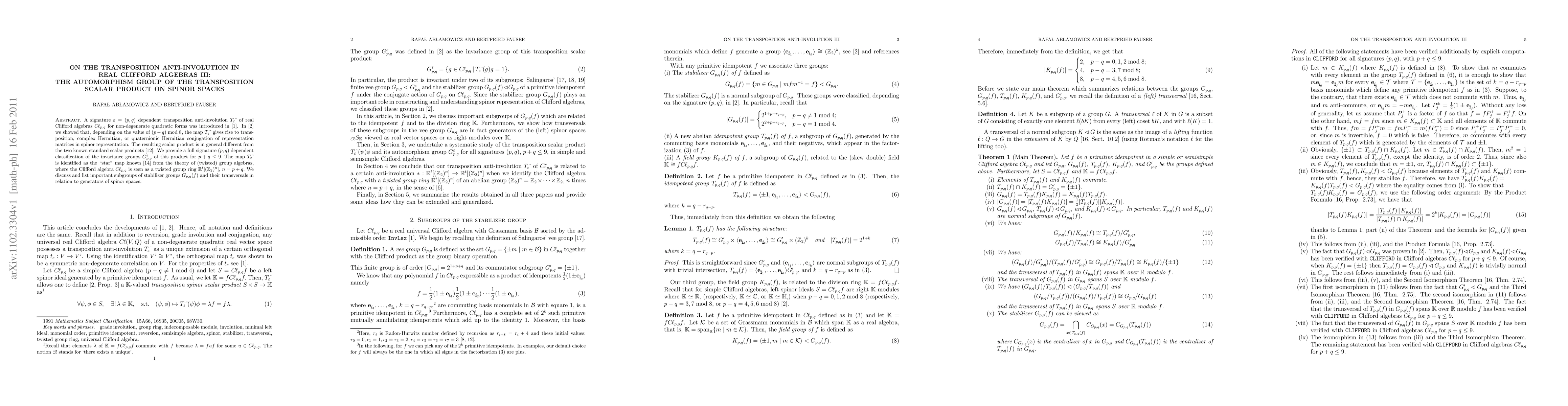 This research classifies the invariance groups Gpq_{p,q} of a transposition scalar product on spinor spaces in real Clifford algebras Cl_{p,q}, depending on the signature (p,q). It identifies the transposition anti-involution T as the 'star' map from twisted group ring theory, listing important subgroups and their transversals related to spinor space generators.