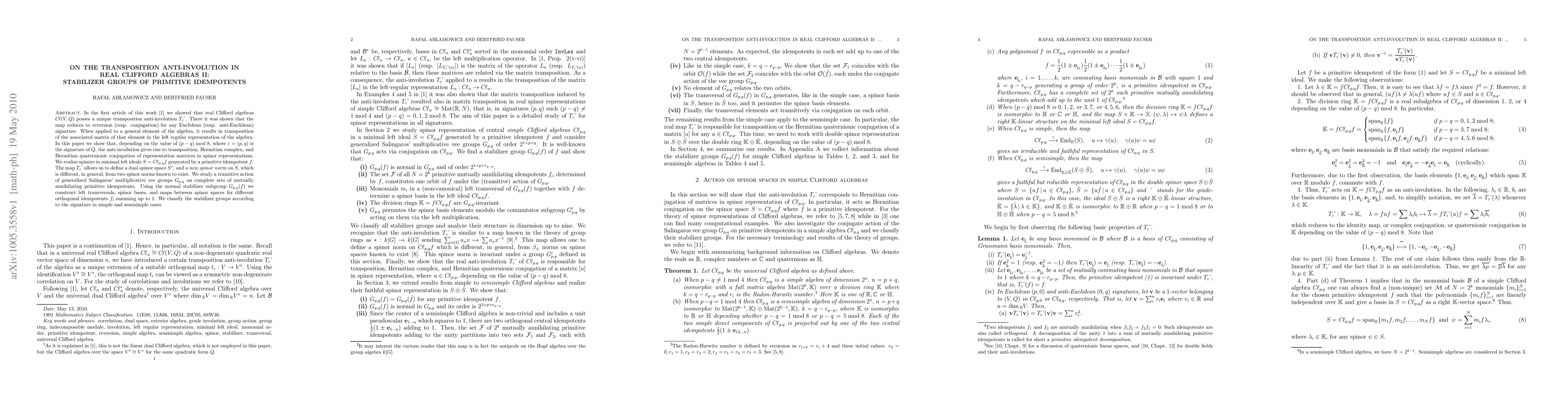 In the first article of this work [... I: The transposition map] we showed that real Clifford algebras CL(V,Q) posses a unique transposition anti-involution \tp. There it was shown that the map reduces to reversion (resp. conjugation) for any Euclidean (resp. anti-Euclidean) signature. When applied to a general element of the algebra, it results in transposition of the associated matrix of that element in the left regular representation of the algebra. In this paper we show that, depending on the value of (p-q) mod 8, where \ve=(p,q) is the signature of Q, the anti-involution gives rise to transposition, Hermitian complex, and Hermitian quaternionic conjugation of representation matrices in spinor representations. We realize spinors in minimal left ideals S=CL_{p,q}f generated by a primitive idempotent f. The map \tp allows us to define a dual spinor space S^\ast, and a new spinor norm on S, which is different, in general, from two spinor norms known to exist. We study a transitive action of generalized Salingaros' multiplicative vee groups G_{p,q} on complete sets of mutually annihilating primitive idempotents. Using the normal stabilizer subgroup G_{p,q}(f) we construct left transversals, spinor bases, and maps between spinor spaces for different orthogonal idempotents f_i summing up to 1. We classify the stabilizer groups according to the signature in simple and semisimple cases.