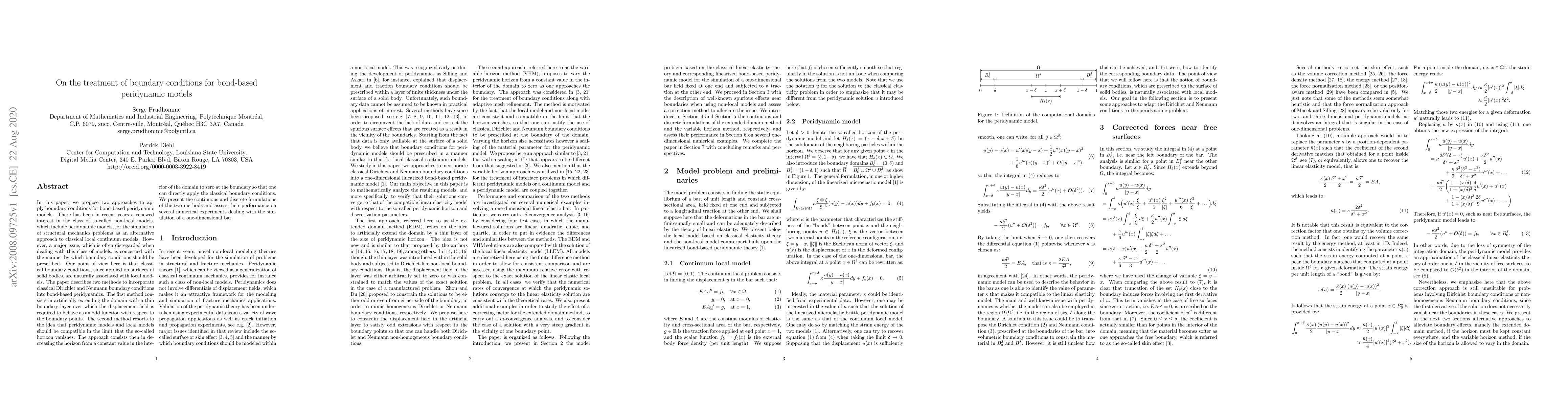This paper proposes two methods for applying boundary conditions in bond-based peridynamic models, addressing the challenge of integrating classical boundary conditions into non-local peridynamic simulations. The methods involve extending the domain with a thin boundary layer and adjusting the horizon to zero at the boundary for compatibility with local models.
