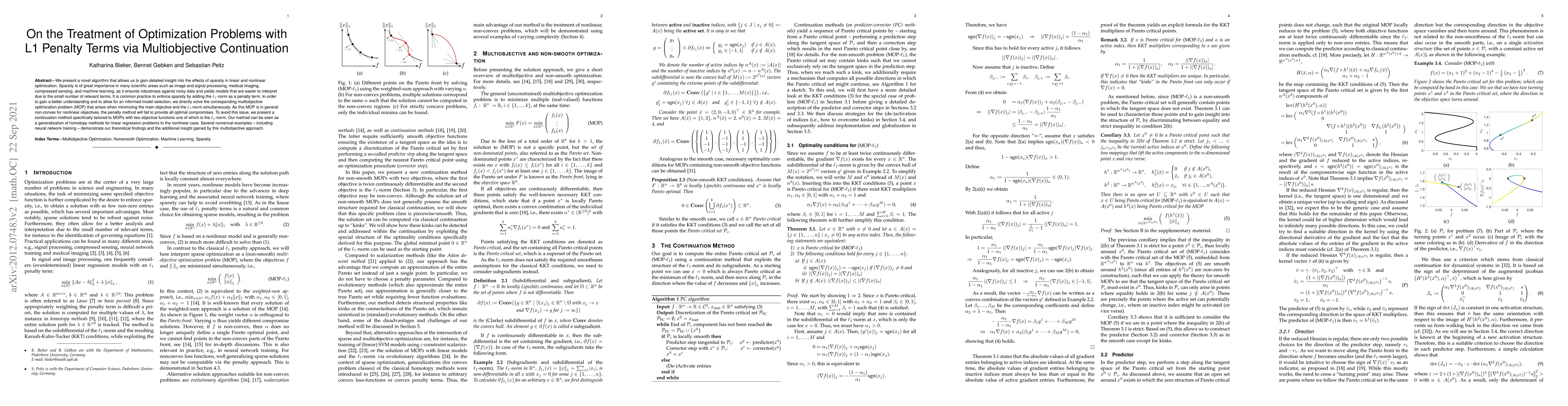 This paper introduces a novel continuation algorithm for solving optimization problems with L1 penalty terms, aiming to achieve sparsity in linear and nonlinear models. It addresses the non-convex nature of multiobjective optimization problems by using a tailored continuation method, providing insights into model selection and robustness against noisy data.