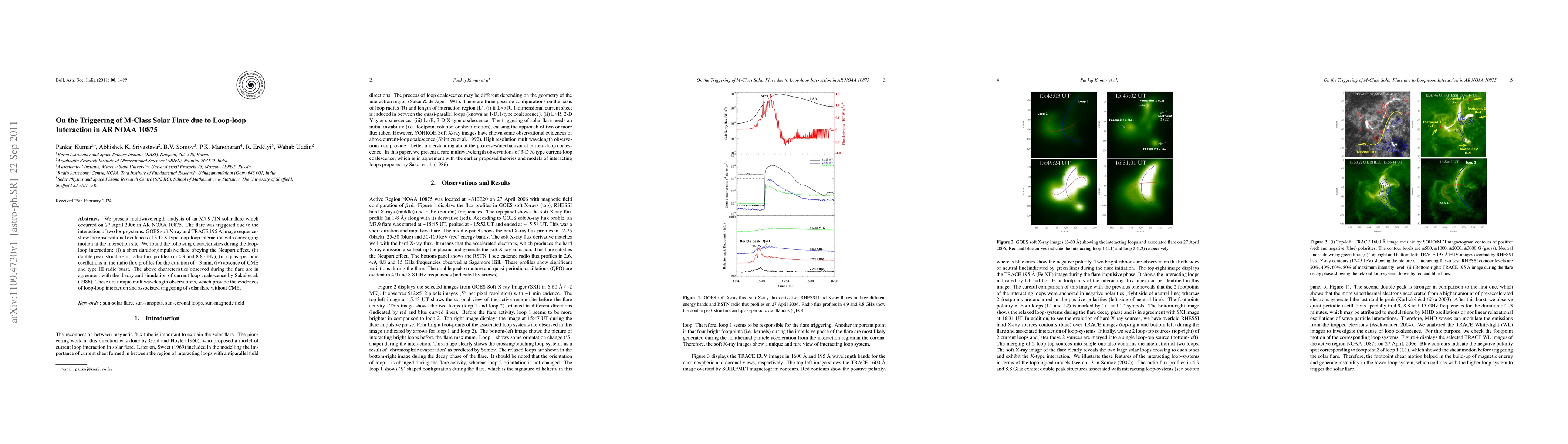 We present multiwavelength analysis of an M7.9 /1N solar flare which occurred on 27 April 2006 in AR NOAA 10875. The flare was triggered due to the interaction of two loop systems. GOES soft X-ray and TRACE 195 {\AA} image sequences show the observational evidences of 3-D X-type loop-loop interaction with converging motion at the interaction site. We found the following characteristics during the loop- loop interaction: (i) a short duration/impulsive flare obeying the Neupart effect, (ii) double peak structure in radio flux profiles (in 4.9 and 8.8 GHz), (iii) quasi-periodic oscillations in the radio flux profiles for the duration of \sim3 min, (iv) absence of CME and type III radio burst. The above characteristics observed during the flare are in agreement with the theory and simulation of current loop coalescence by Sakai et al. (1986). These are unique multiwavelength observations, which provide the evidences of loop-loop interaction and associated triggering of solar flare without CME.