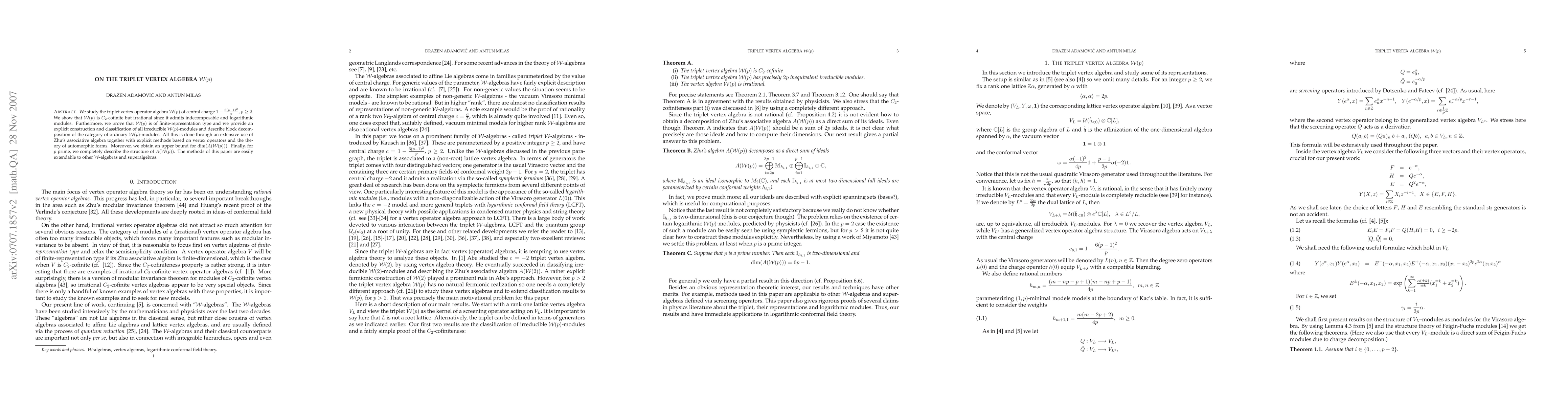 We study the triplet vertex operator algebra $\mathcal{W}(p)$ of central charge $1-\frac{6(p-1)^2}{p}$, $p \geq 2$. We show that $\trip$ is $C_2$-cofinite but irrational since it admits indecomposable and logarithmic modules. Furthermore, we prove that $\trip$ is of finite-representation type and we provide an explicit construction and classification of all irreducible $\mathcal{W}(p)$-modules and describe block decomposition of the category of ordinary $\trip$-modules. All this is done through an extensive use of Zhu's associative algebra together with explicit methods based on vertex operators and the theory of automorphic forms. Moreover, we obtain an upper bound for ${\rm dim}(A(\mathcal{W}(p)))$. Finally, for $p$ prime, we completely describe the structure of $A(\trip)$. The methods of this paper are easily extendable to other $\mathcal{W}$-algebras and superalgebras.