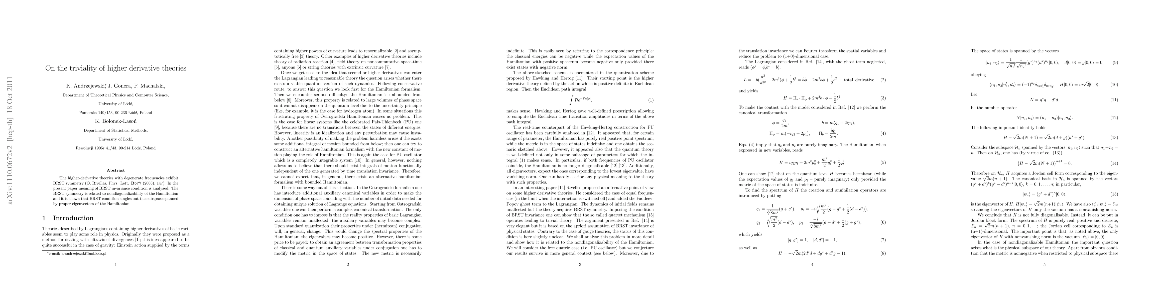 The higher-derivative theories with degenerate frequencies exhibit BRST symmetry (O. Rivelles, Phys. Lett. B577 (2003), 147). In the present paper meaning of BRST invariance condition is analyzed. The BRST symmetry is related to nondiagonalizability of the Hamiltonian and it is shown that BRST condition singles out the subspace spanned by proper eigenvectors of the Hamiltonian.