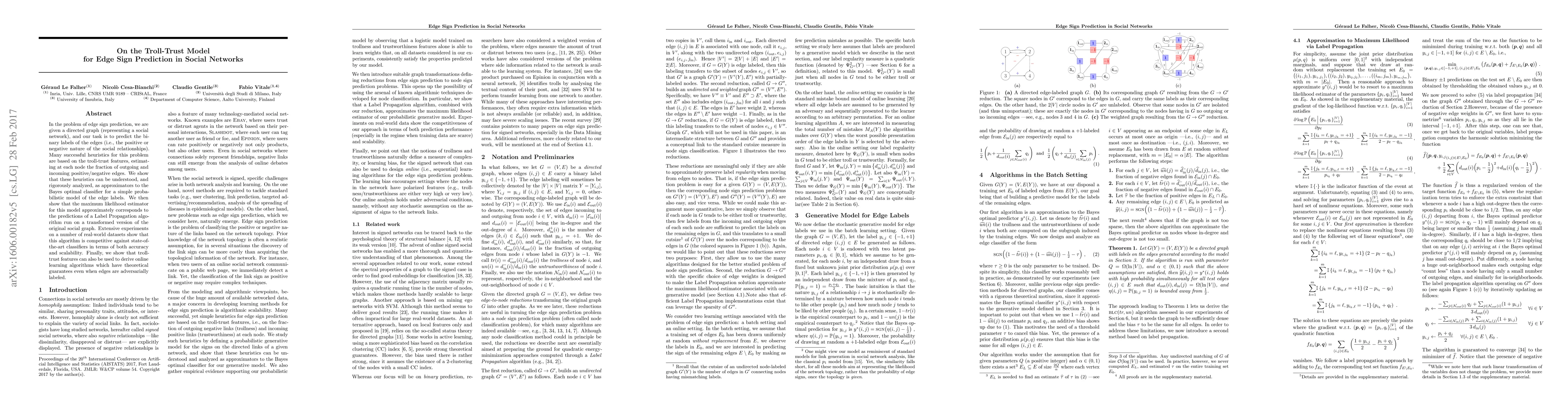 This paper proposes a Troll-Trust Model for edge sign prediction in social networks, demonstrating that heuristics based on troll-trust features approximate the Bayes optimal classifier. The model's maximum likelihood estimator aligns with Label Propagation algorithms, showing competitive accuracy and scalability on real-world datasets.