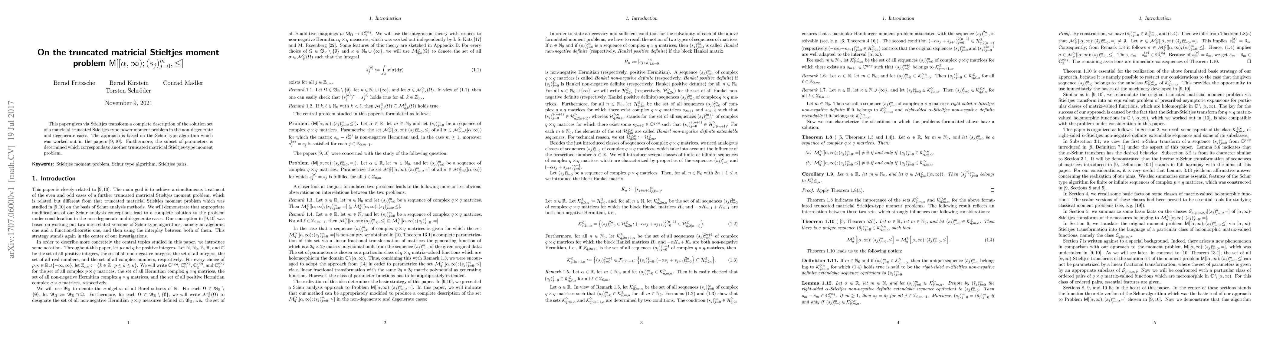 This paper provides a complete solution set for a matricial truncated Stieltjes-type power moment problem using the Stieltjes transform and the Schur type algorithm, addressing both non-degenerate and degenerate cases. It also identifies the subset of parameters for another related truncated matricial Stieltjes-type moment problem.