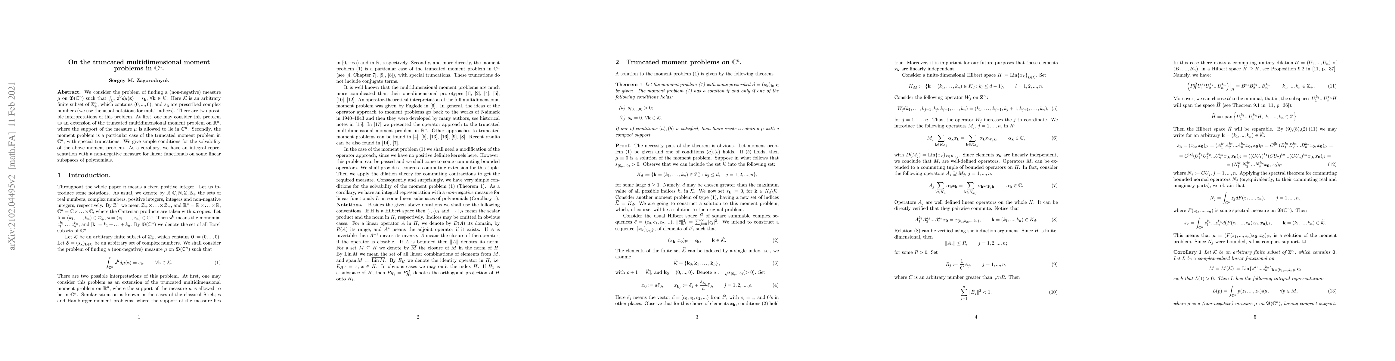 We consider the problem of finding a (non-negative) measure $\mu$ on $\mathfrak{B}(\mathbb{C}^n)$ such that $\int_{\mathbb{C}^n} \mathbf{z}^{\mathbf{k}} d\mu(\mathbf{z}) = s_{\mathbf{k}}$, $\forall \mathbf{k}\in\mathcal{K}$. Here $\mathcal{K}$ is an arbitrary finite subset of $\mathbb{Z}^n_+$, which contains $(0,...,0)$, and $s_{\mathbf{k}}$ are prescribed complex numbers (we use the usual notations for multi-indices). There are two possible interpretations of this problem. At first, one may consider this problem as an extension of the truncated multidimensional moment problem on $\mathbb{R}^n$, where the support of the measure $\mu$ is allowed to lie in $\mathbb{C}^n$. Secondly, the moment problem is a particular case of the truncated moment problem in $\mathbb{C}^n$, with special truncations. We give simple conditions for the solvability of the above moment problem. As a corollary, we have an integral representation with a non-negative measure for linear functionals on some linear subspaces of polynomials.