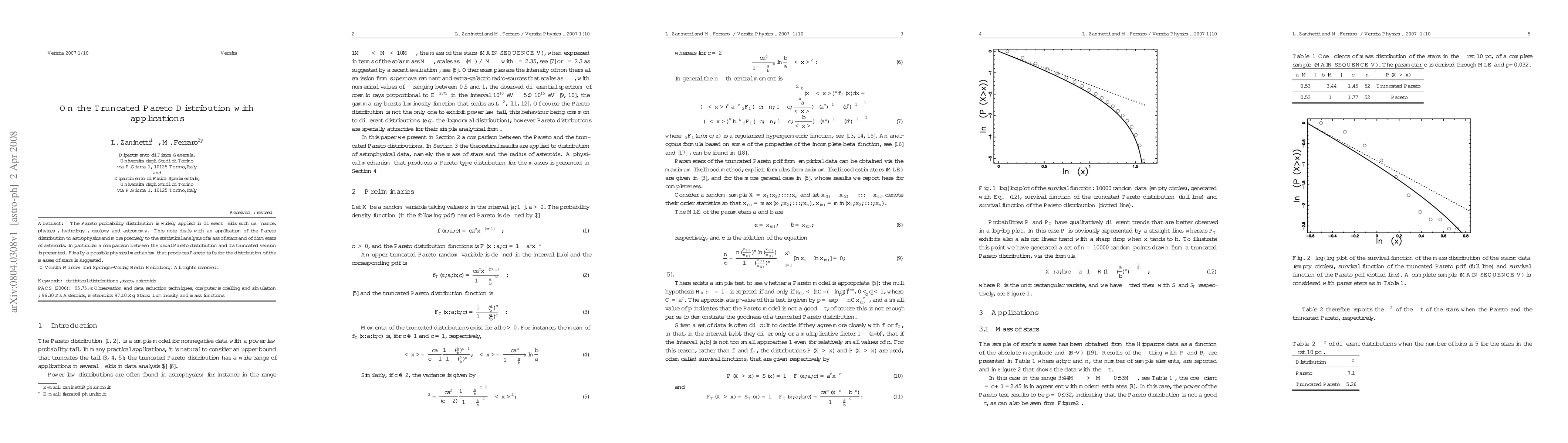 The paper presents a comparative analysis of Pareto and truncated Pareto distributions for astrophysical mass and diameter datasets, offering a growth model for Pareto tails in star masses.